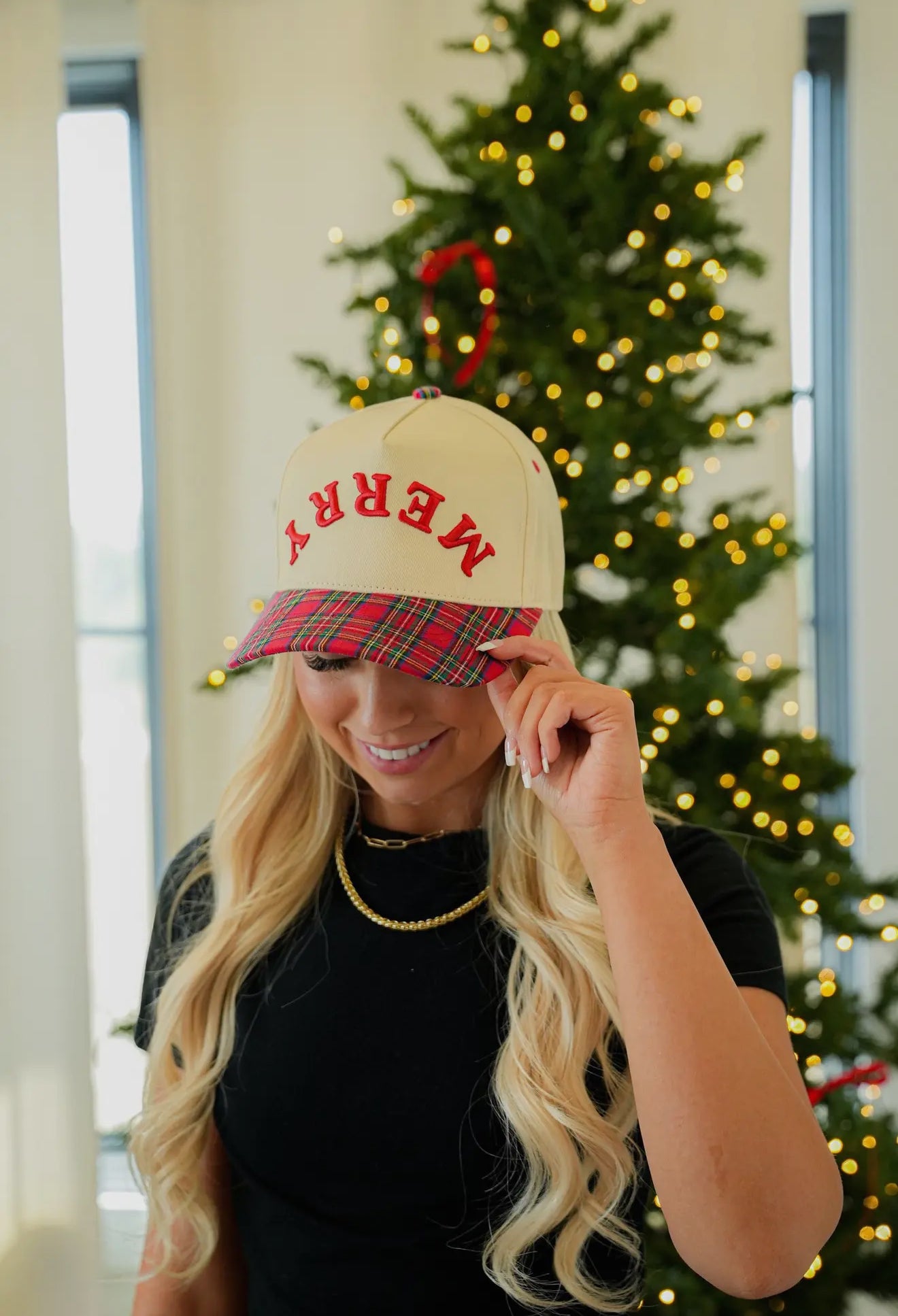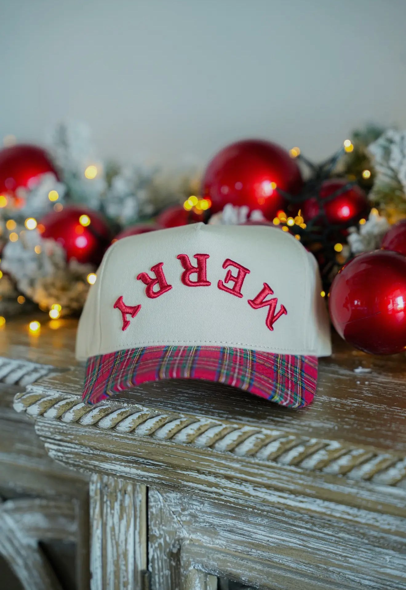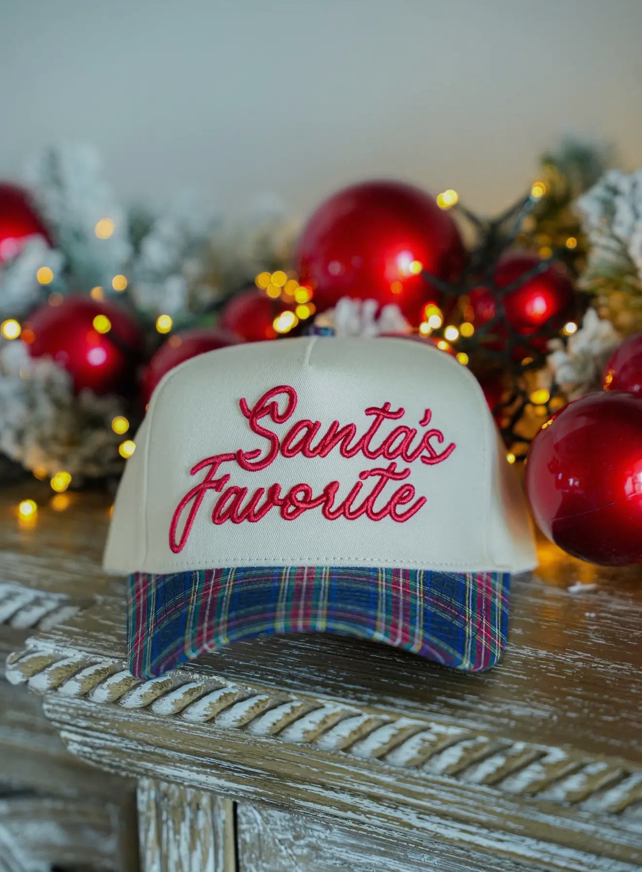 One features “Santa’s Favorite” embroidered across the front with a navy tartan plaid bill — classic, cool, and just the right amount of Christmas charm. The other shows “MERRY” written upside down and matching red tartan plaid bill — a nod to all things joyful and bright.