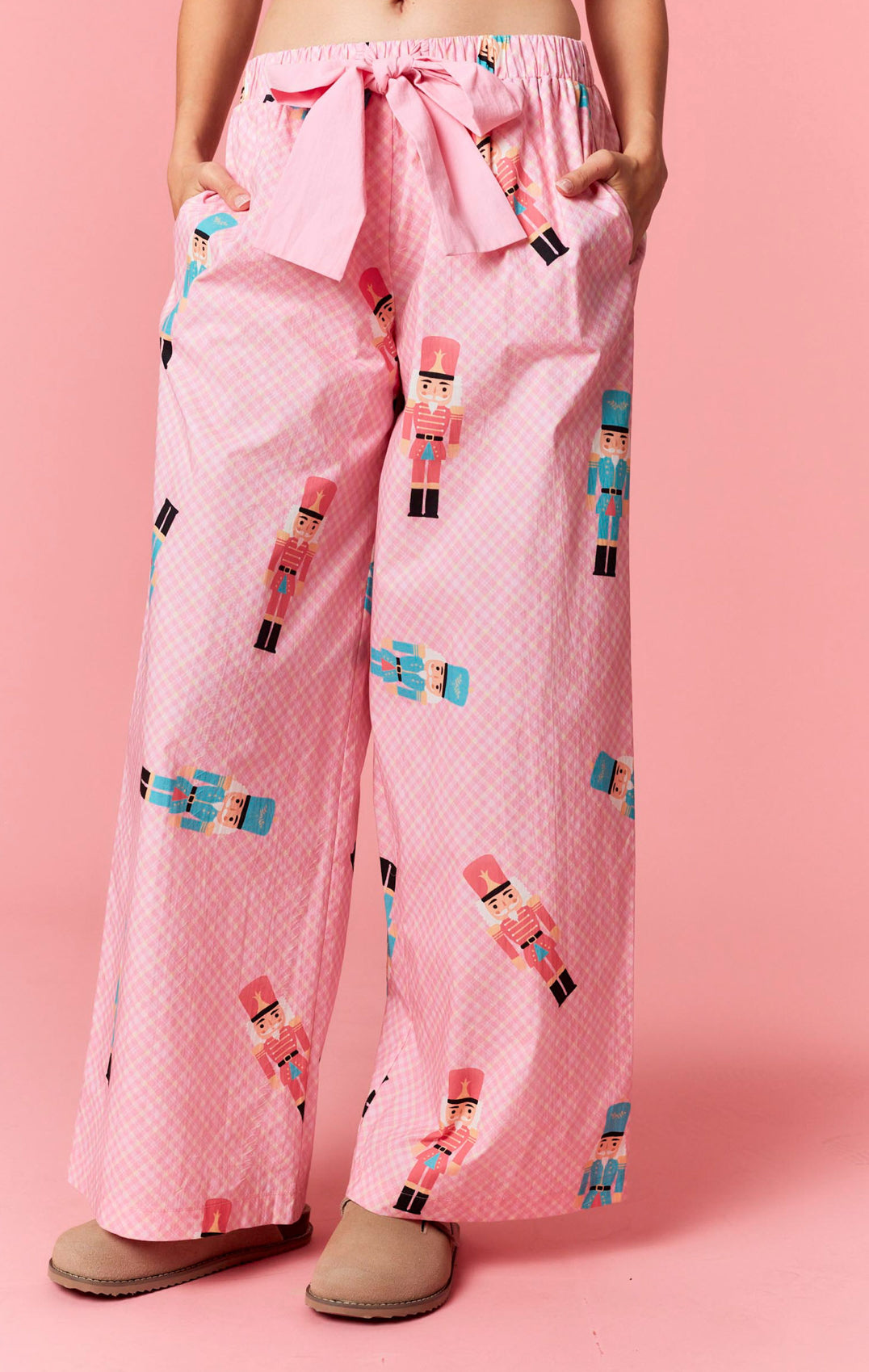 March into the holidays in style with these light pink cotton PJ pants, sprinkled with the cutest toy soldier print. Designed with a comfy pop-on fit and a satin drawstring ribbon at the waist, they’re as cozy as they are charming. Perfect for Christmas mornings, movie nights, or gifting to your favorite holiday pajama lover!