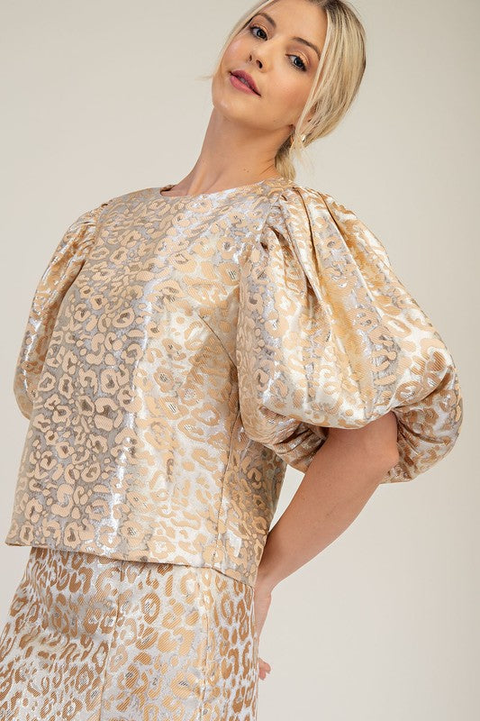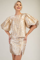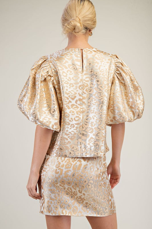 Turn heads this holiday season in this gold leopard set that’s made to sparkle! The top features a classic round neckline and playful puff sleeves, while the matching mini skirt brings the sass with its flattering fit and shimmer. The metallic leopard print adds the perfect dose of glam—ideal for festive parties, girls’ nights, or ringing in the New Year. Just add heels and a bold lip!
