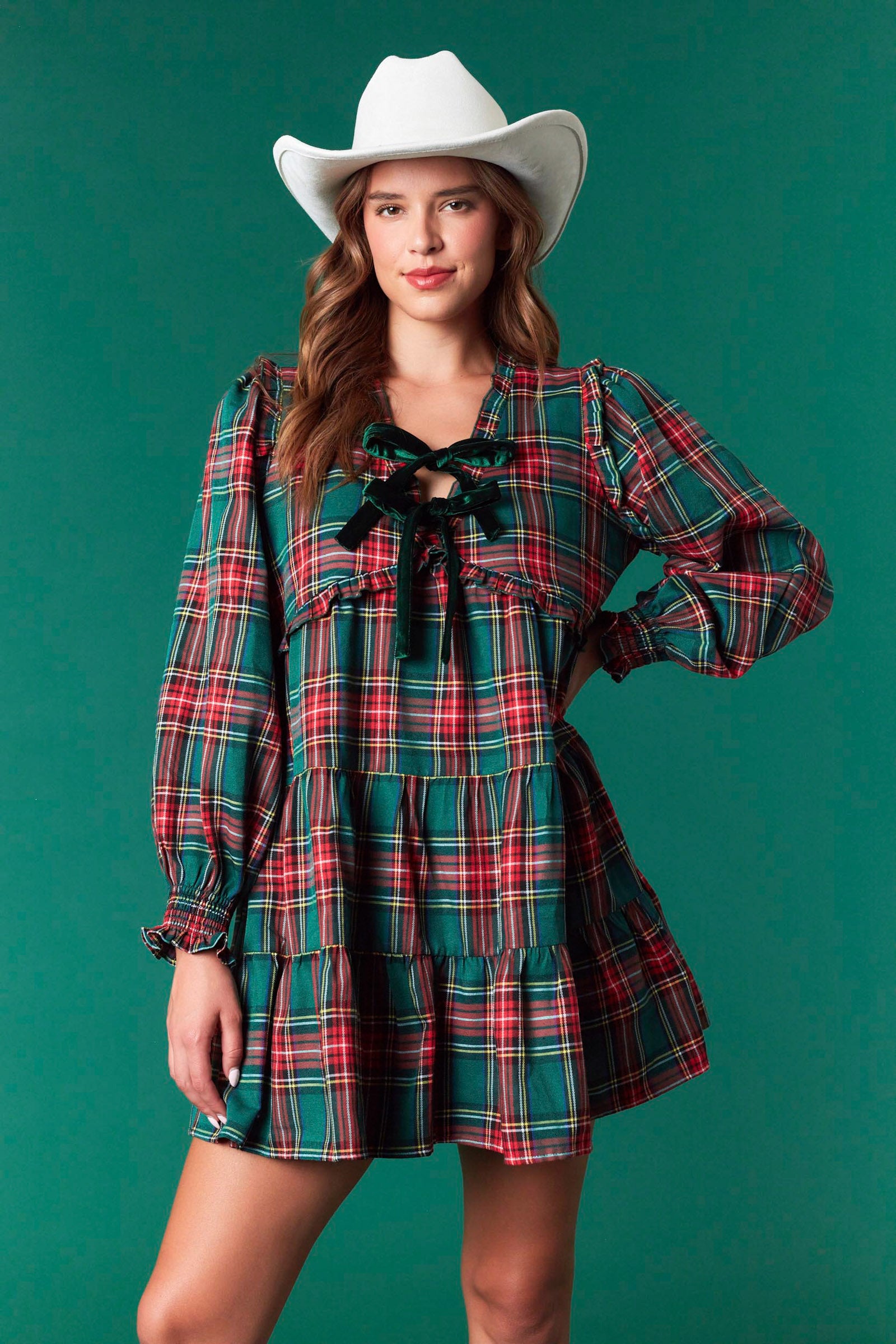 Festive and flirty, this plaid ruffle tier mini dress is finished with the sweetest velvet bow tie detail for a touch of holiday charm. With its playful tiers and classic plaid print, it’s the perfect piece to wear to a holiday party, family gathering, or just bebopping around town in style. Pair it with tights and boots for a cozy look or dress it up with heels for a night out—either way, this little dress is made to shine all season long.