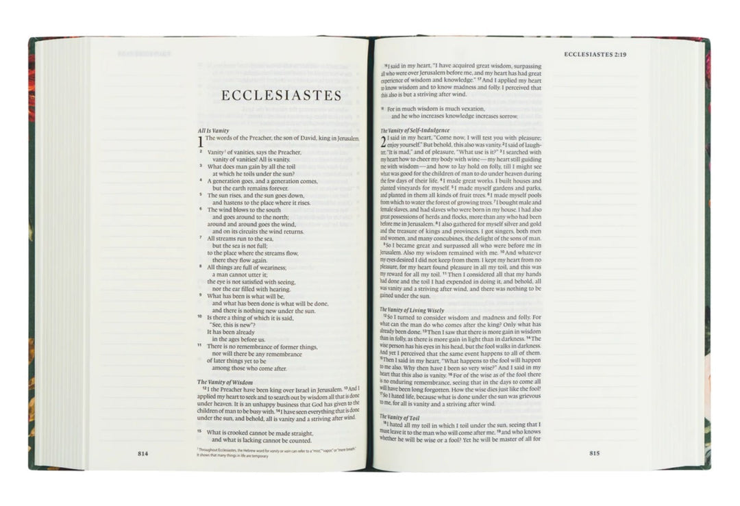 The back cover features this reminder: “His mercies are new every morning; great is your faithfulness,” from Lamentations. This gorgeous Bible is a priceless tool, but its outer beauty is a mere reflection of the breathtaking beauty contained within its pages. The words of this book are your very life.