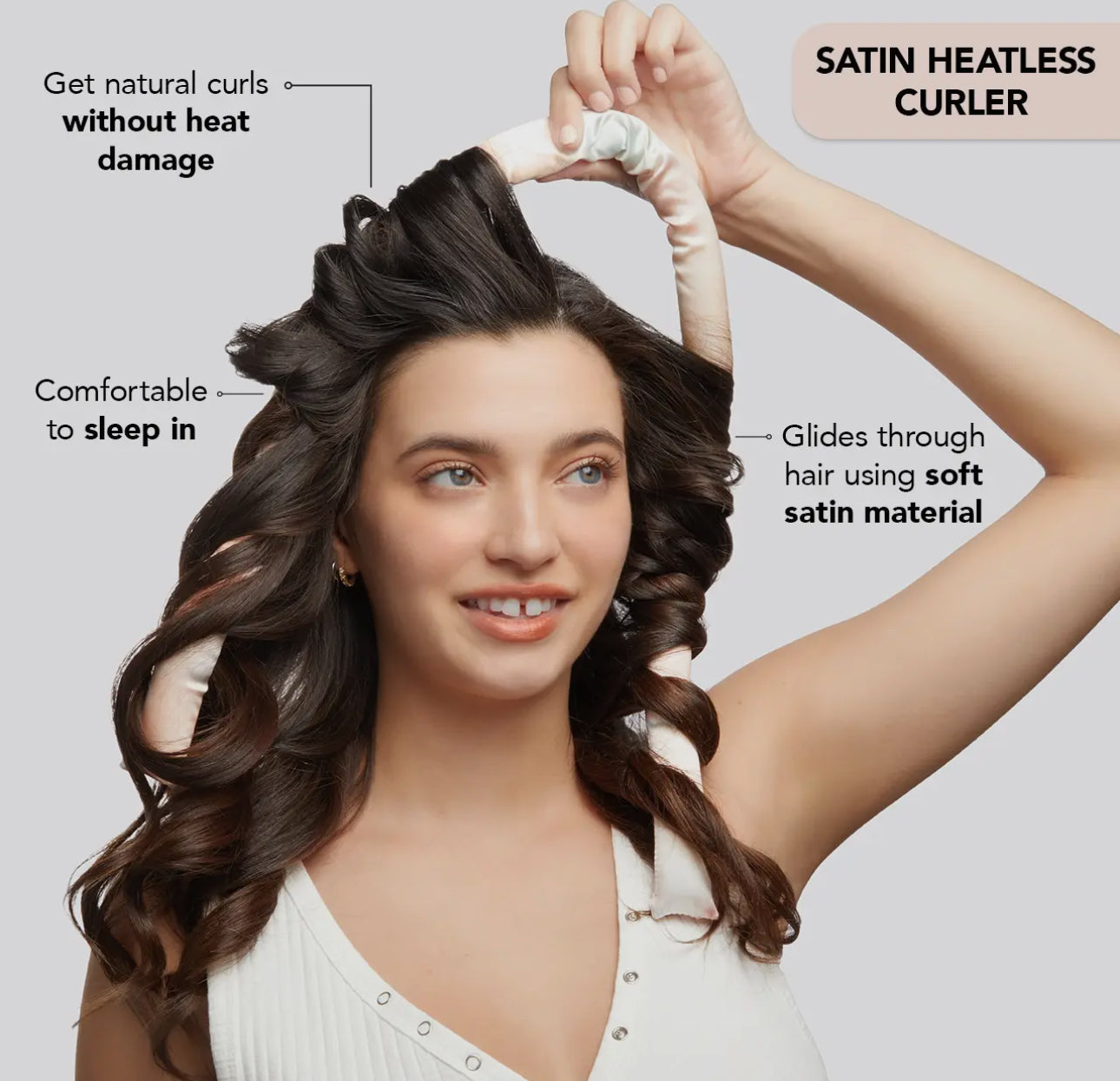 Kitsch Satin Heatless Curling Set allows you to create the perfect waves or curls for a beautiful style - without the heat damage! The satin construction keeps your hair frizz-free and prevents breakage. Simple to use and can be worn day or night!