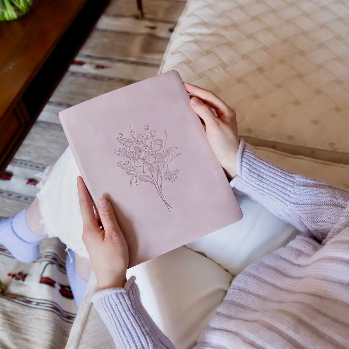 We’ve made our best-selling Shiloh design into a beautiful KJV Bible! Our soft and delicate suede Shiloh Bible is inspired by the town of Shiloh in the state of Georgia, where the neighboring Callaway Gardens house the beautiful Cecil B. Day Butterfly Center. In the same way that butterflies undergo an intricate transformation to reach their full beauty, we pray this Bible works in your heart to transform you from the inside out. The back features this beautiful verse from Matthew 11:28: “Come unto me, all ye that labor and are heavy laden, and I will give you rest.” We pray that as you dive deeper into your faith with the Lord, you will experience the peace and rest that he brings as he takes care of you!