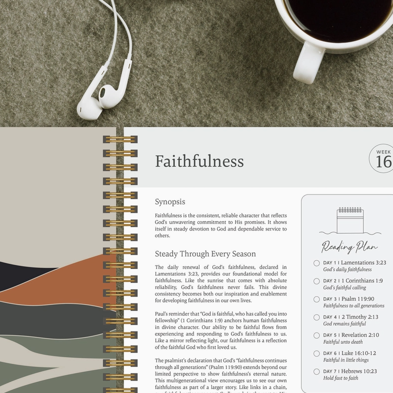 Journey through a year of intentional spiritual growth with this uniquely crafted Bible study that weaves together the major themes of Scripture. A perfect companion to the Spiral Bible to truly understand the text. Unlike traditional chronological or book-by-book approaches, this study illuminates 52 essential themes of the Christian faith, from Creation to Praise, helping you build a comprehensive biblical worldview while developing practical faith.