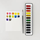 Details: 8.5" x 2". Black tin case. 12 colors: Red, Pink, Orange, Yellow, Yellow ochre, Brown, Green, Olive Green, Blue, Navy, Purple, Black. Round size 4 brush included.