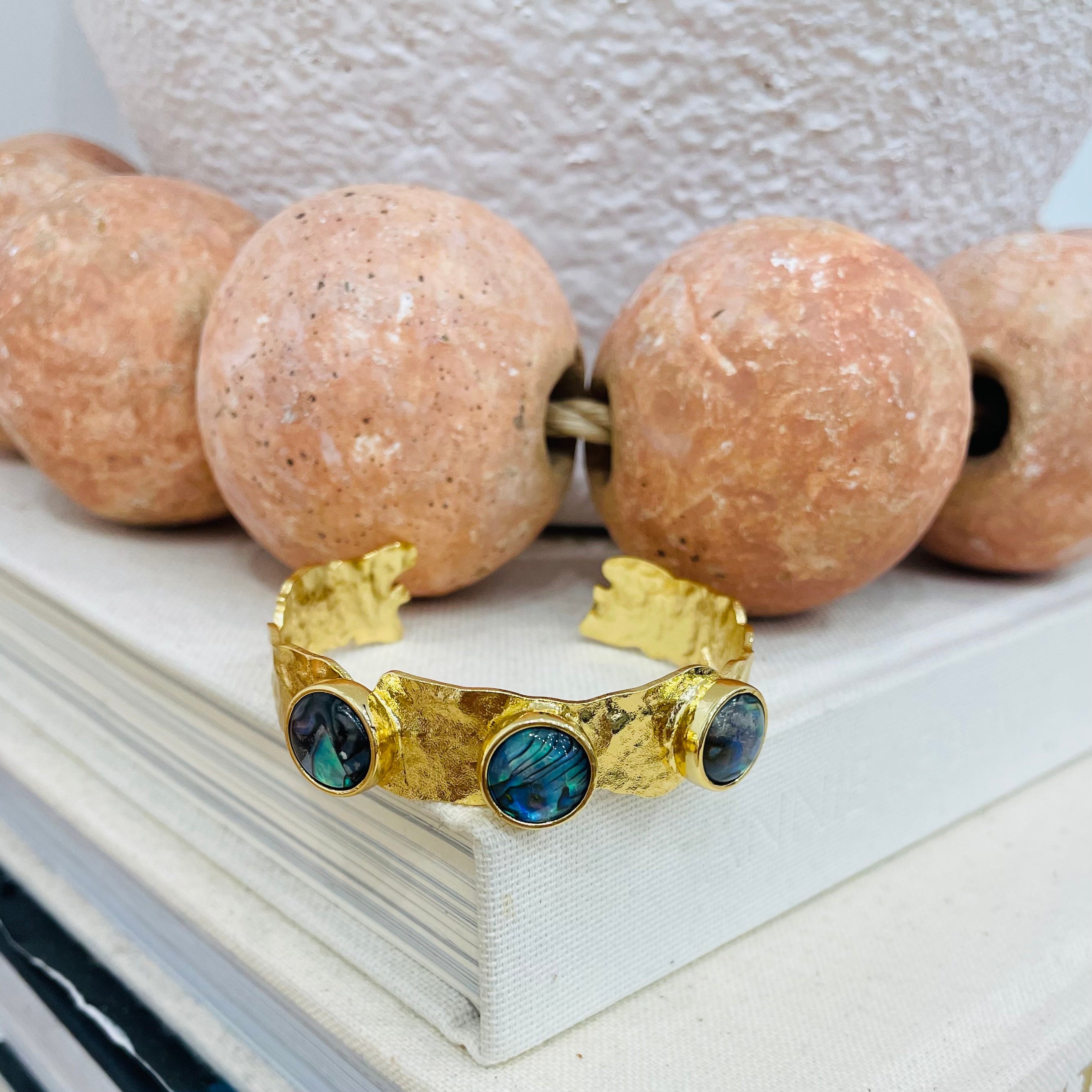 Show off your style with the Hudson Day Triple Stone Cuff. Featuring abalone shell and luxurious 18K gold plating, this cuff will add a touch of elegance to any outfit. With its unique design and high-quality materials, it's the perfect statement piece for any occasion.
