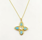 Discover a bold addition to your jewelry collection with our turquoise and pearl cross shaped statement necklace. Crafted with expert craftsmanship, this necklace brings a touch of elegance with its unique design. A perfect accessory to elevate any outfit.
