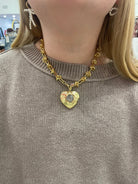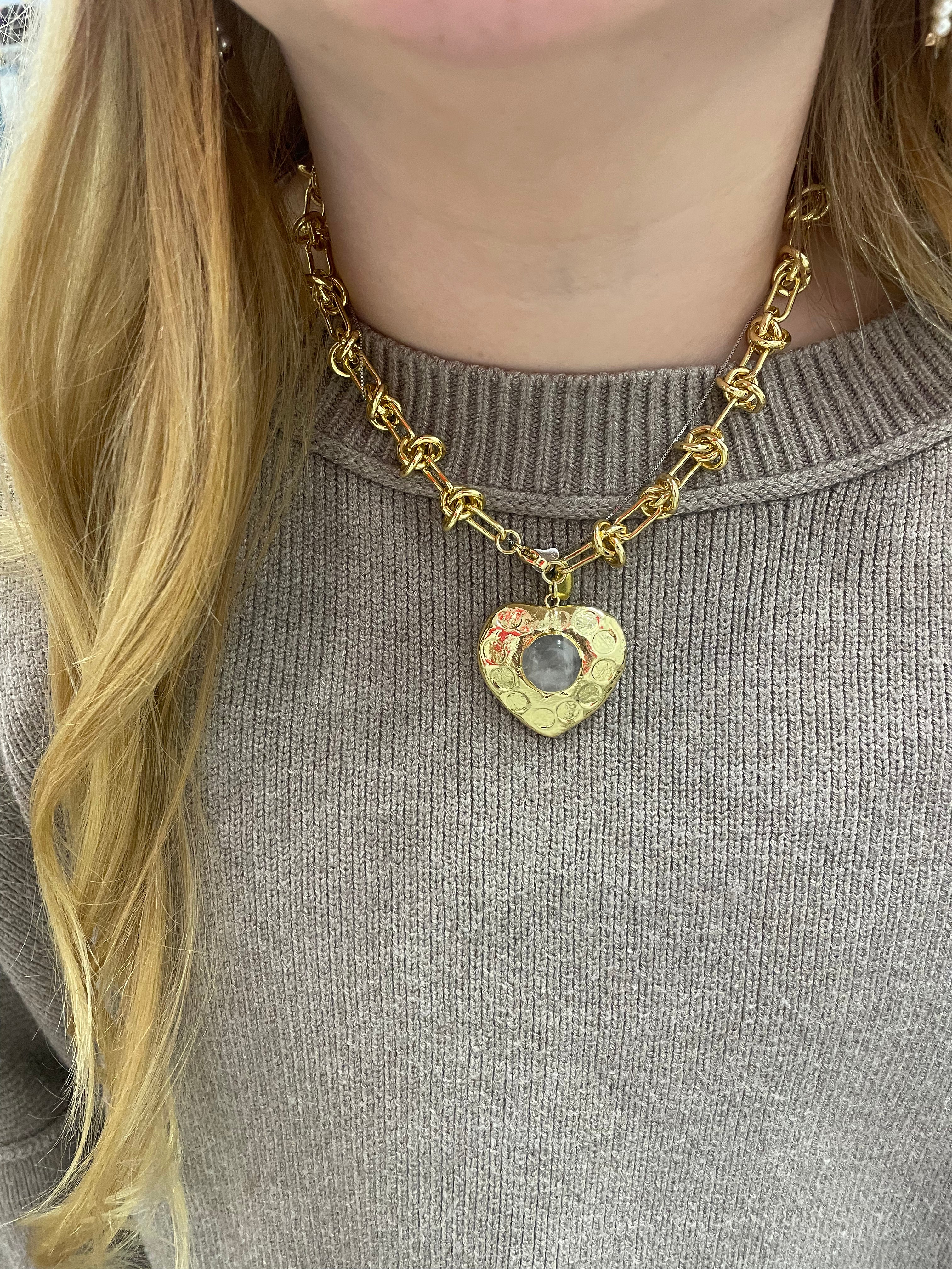 Elevate your style with our Stone Heart Necklace by Hudson Day. This stunning gold necklace features an eye-catching heart pendant adorned with a vibrant and luxurious purple stone. Make a statement and add a touch of elegance to any outfit. A must-have for any jewelry collection!