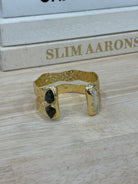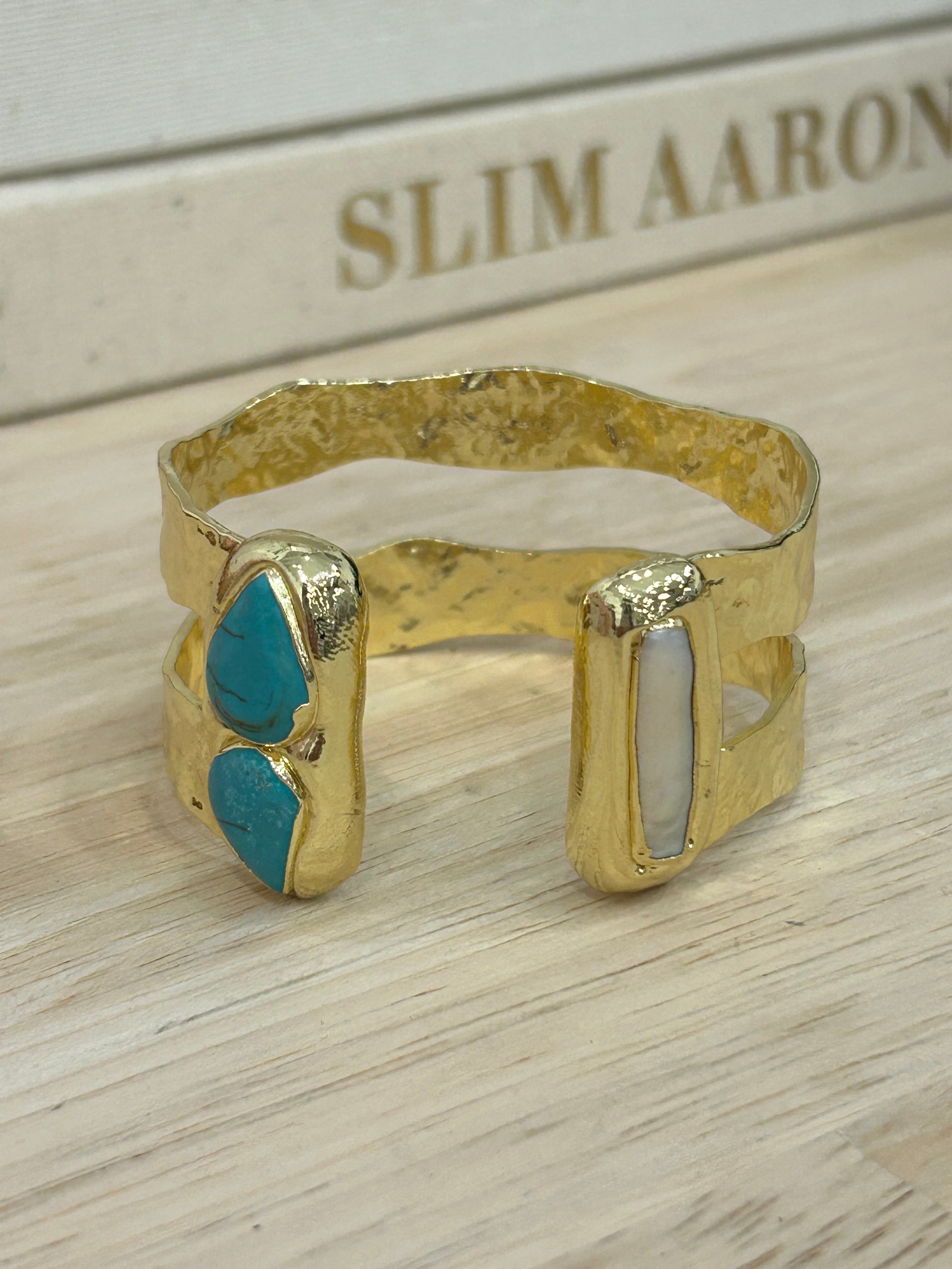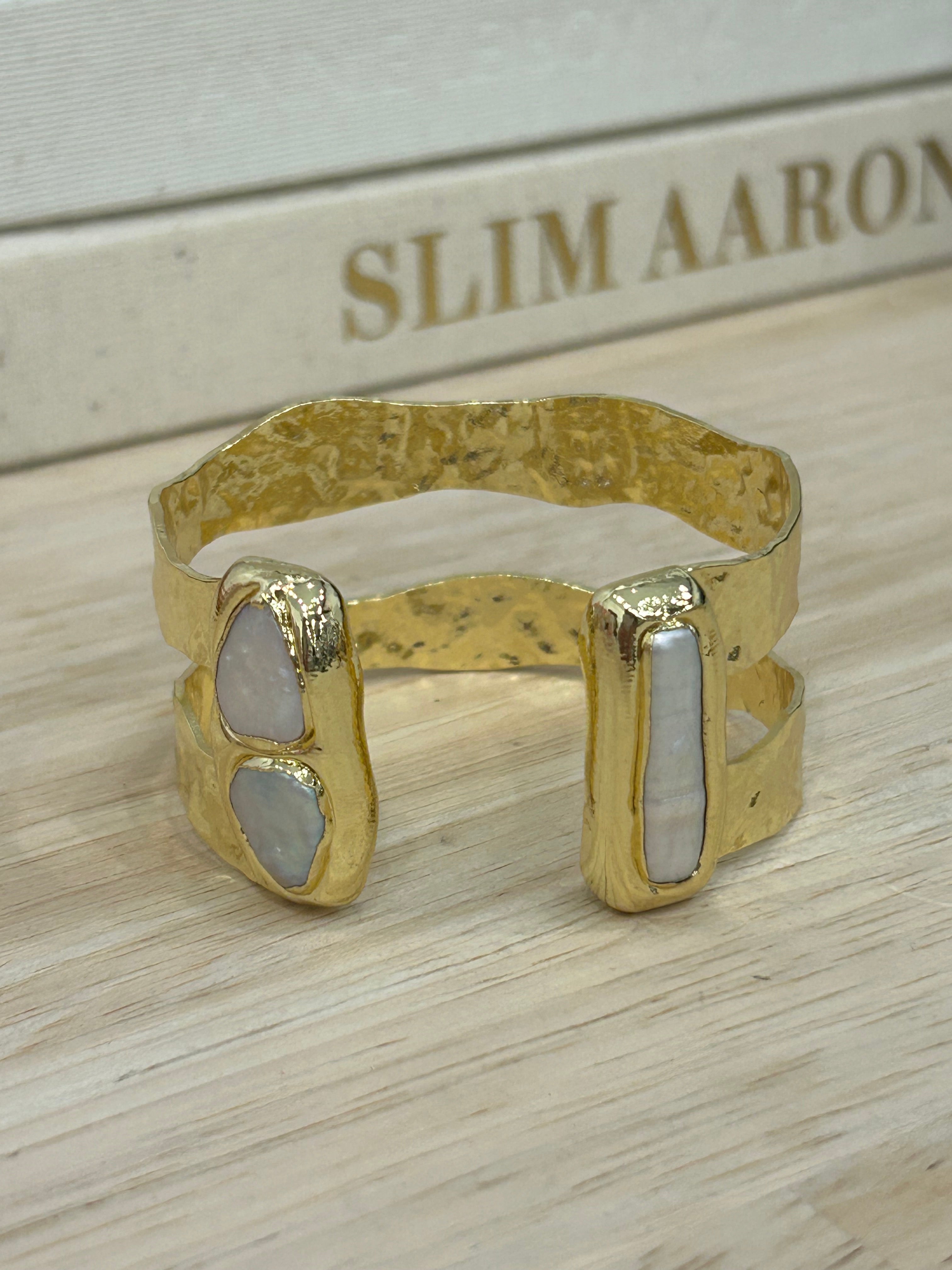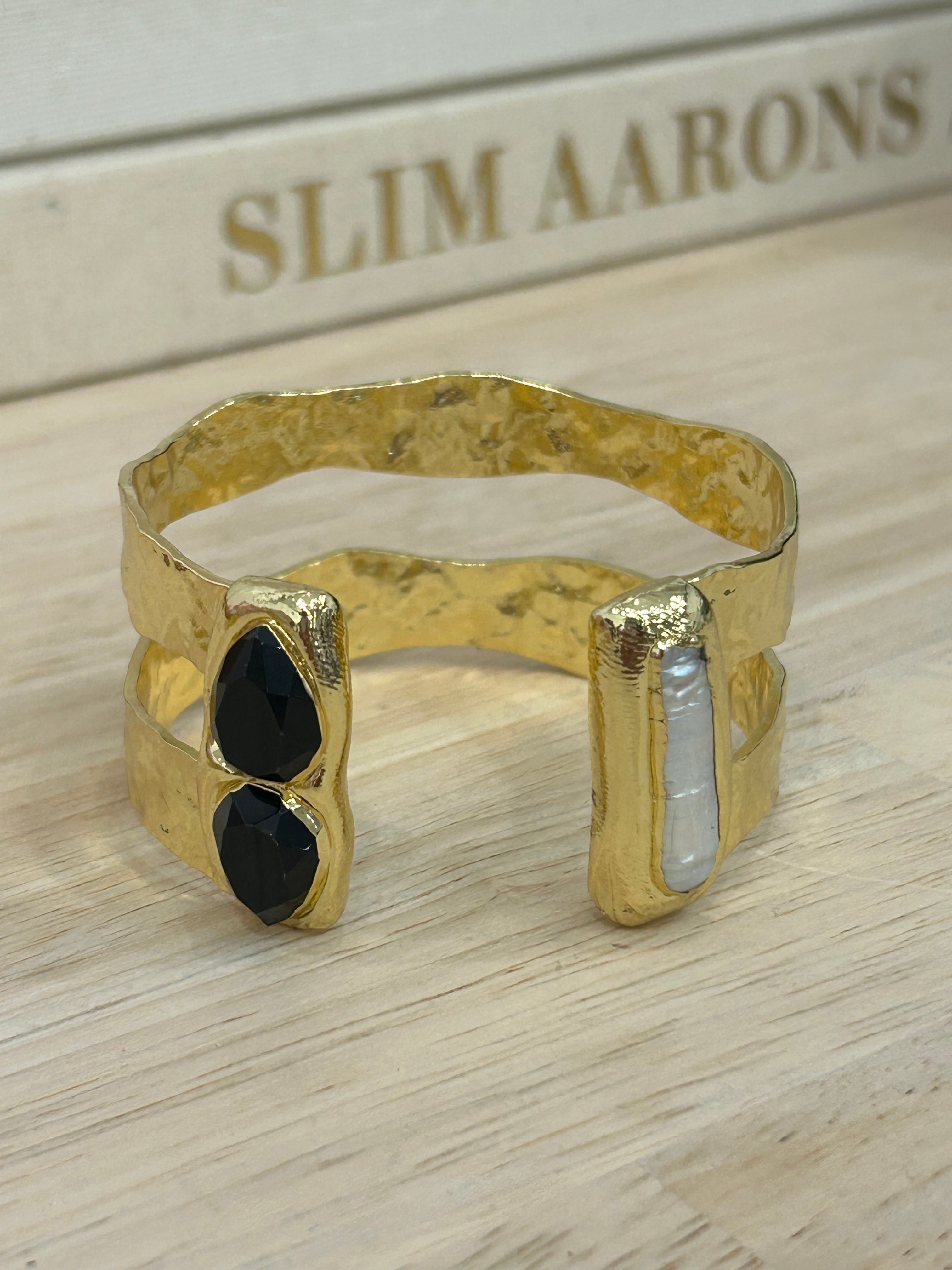 This Teague Cuff by Hudson Day features a double cuff design with pearls and stones, plated in 18k gold to resist tarnishing. Its sleek and sophisticated appearance exudes elegance and style.