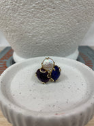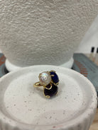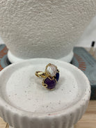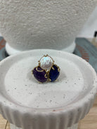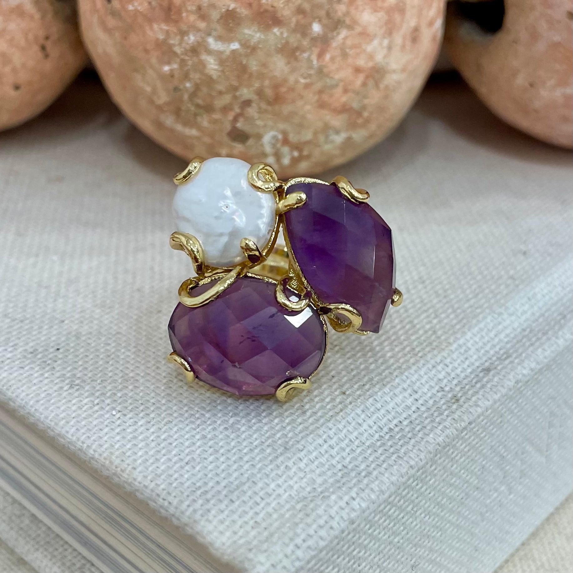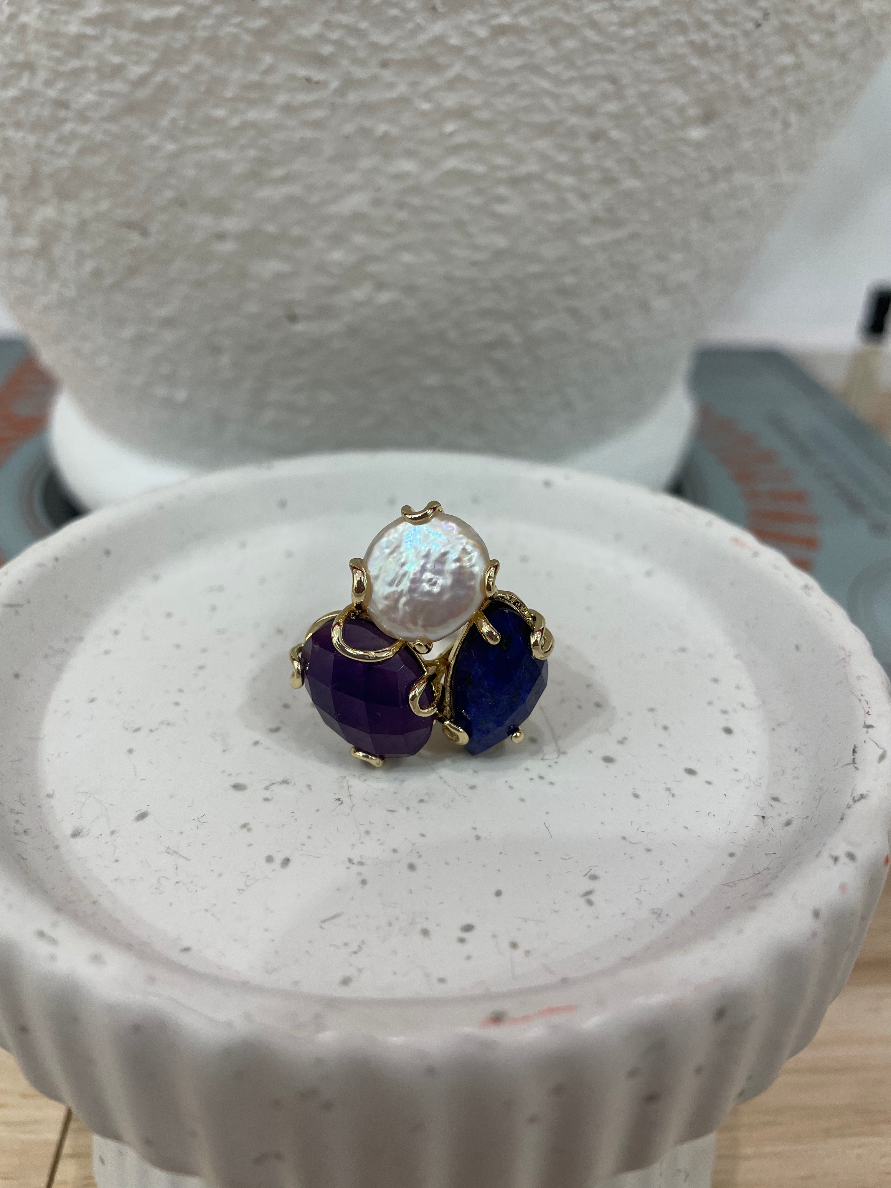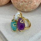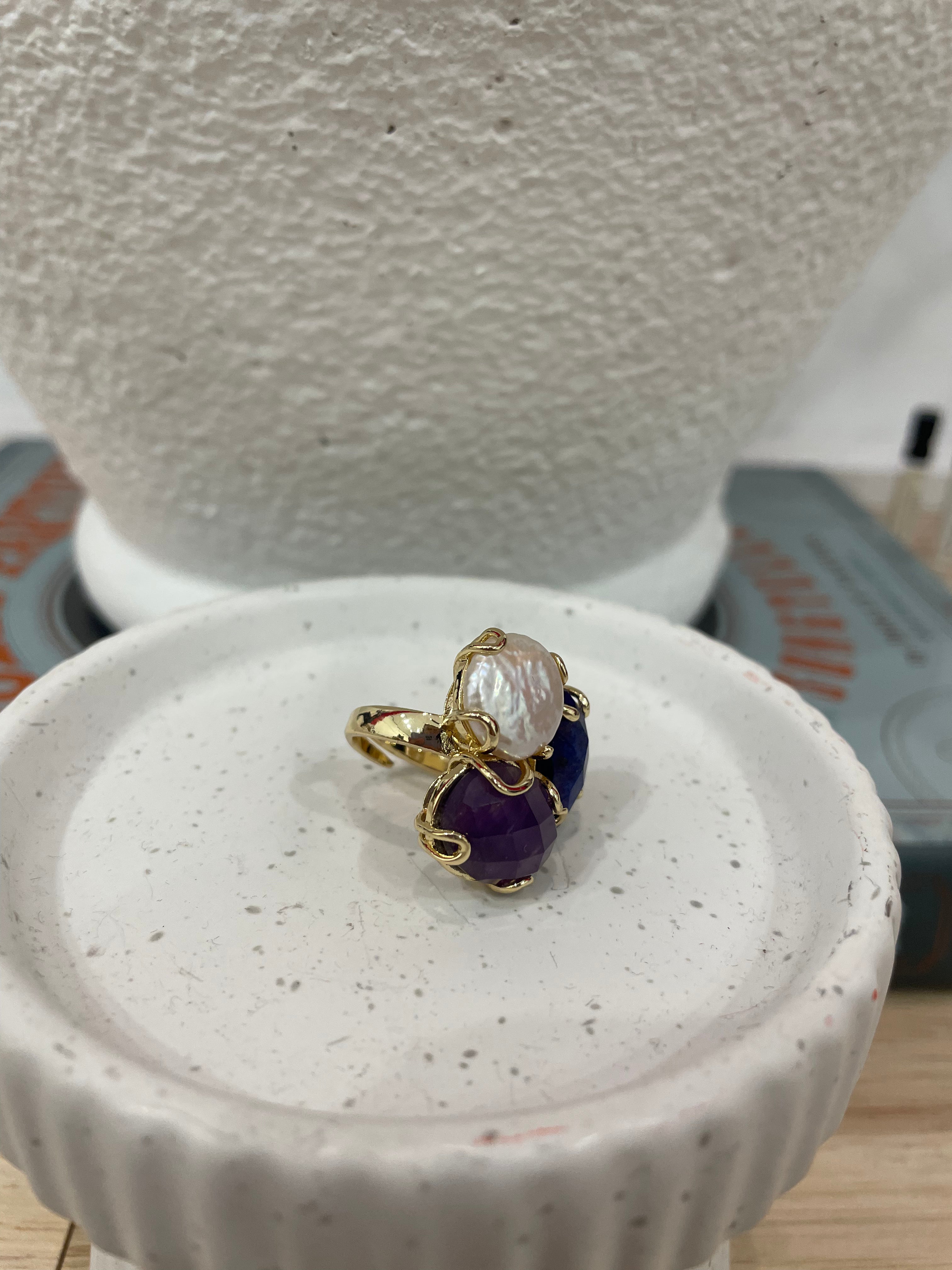 This elegant Three Stone Ring by Hudson Day features a gold band with three stunning stones in various colors. Its timeless design and high quality materials make it a must-have addition to any jewelry collection. Expertly crafted for a sophisticated and classic look.