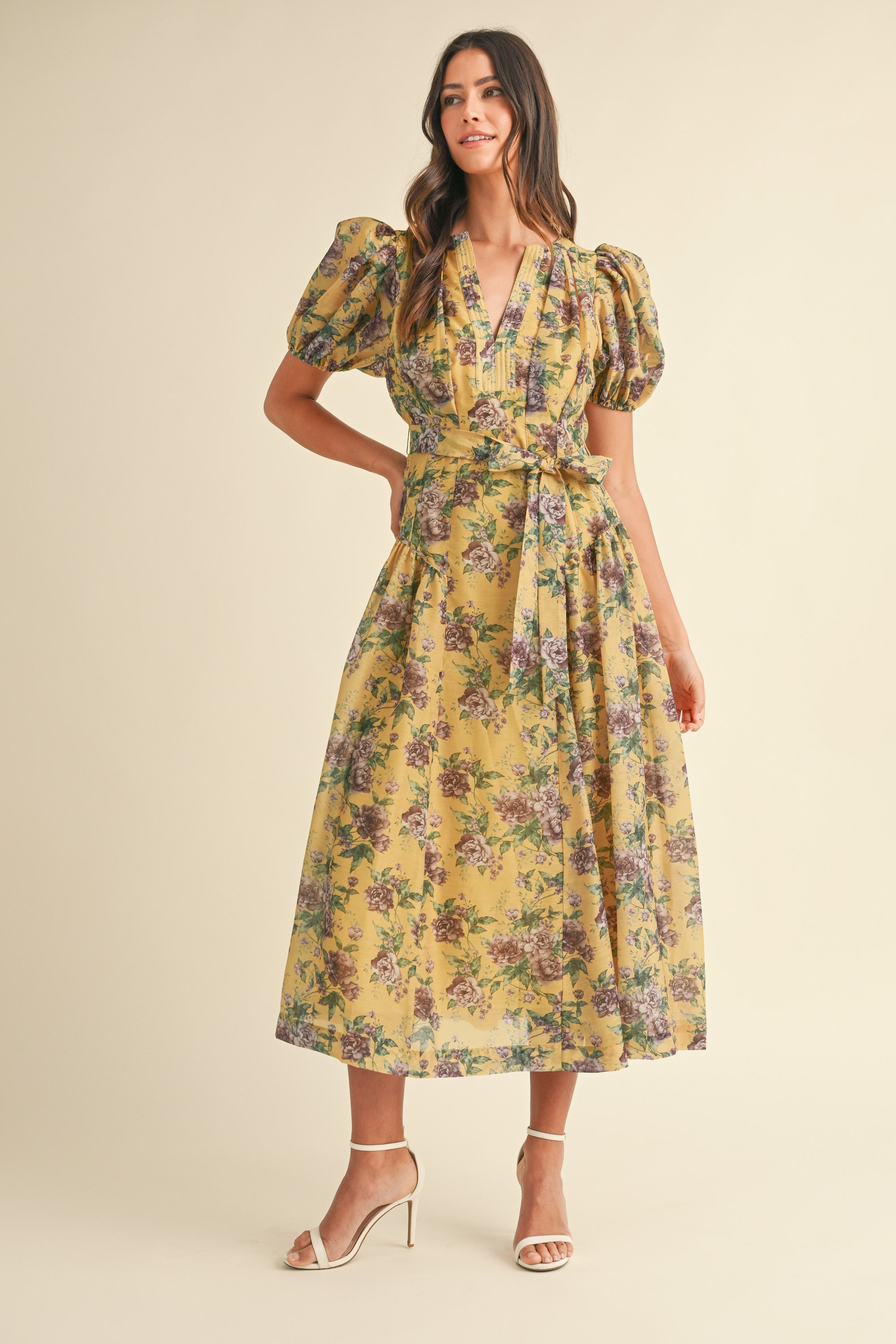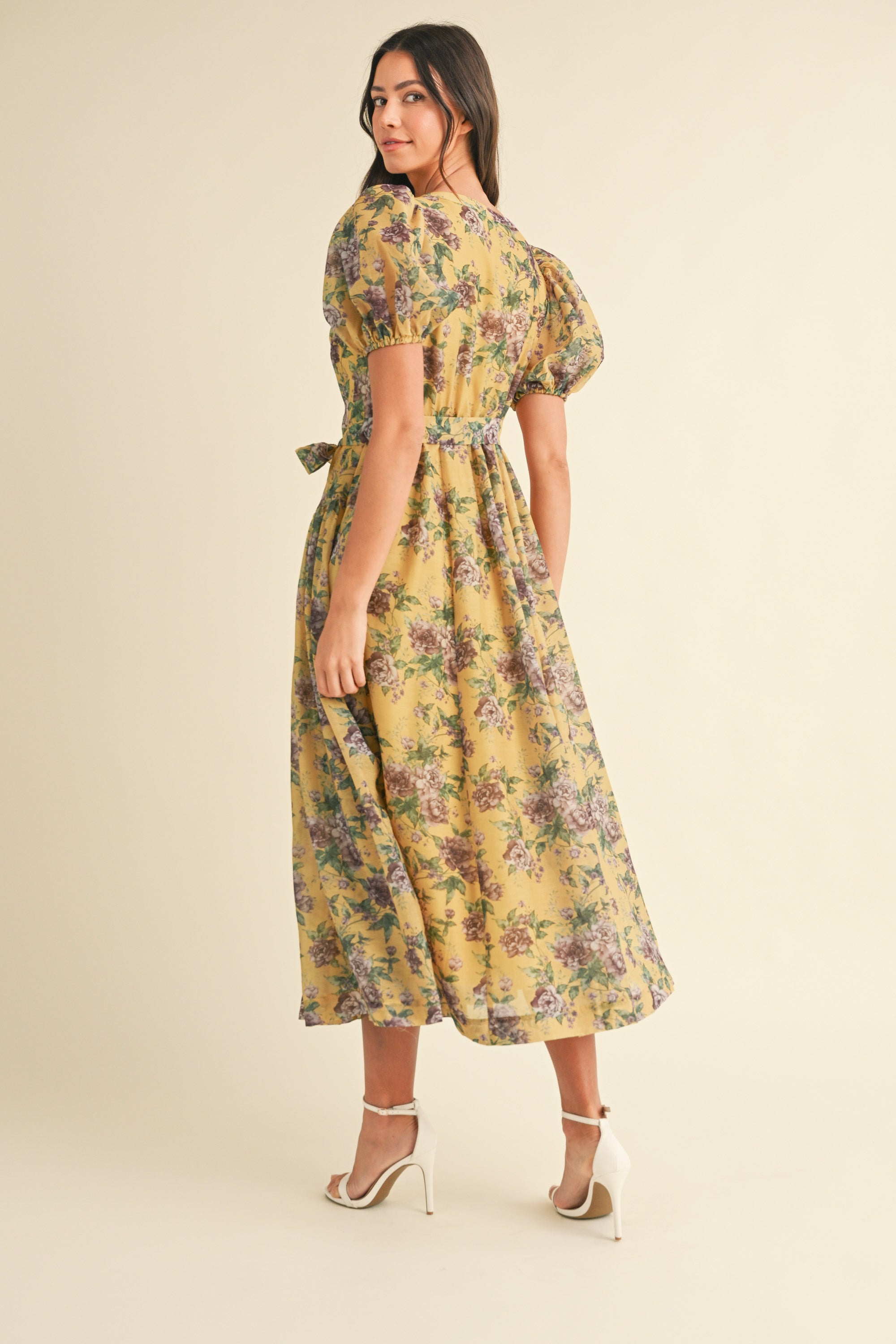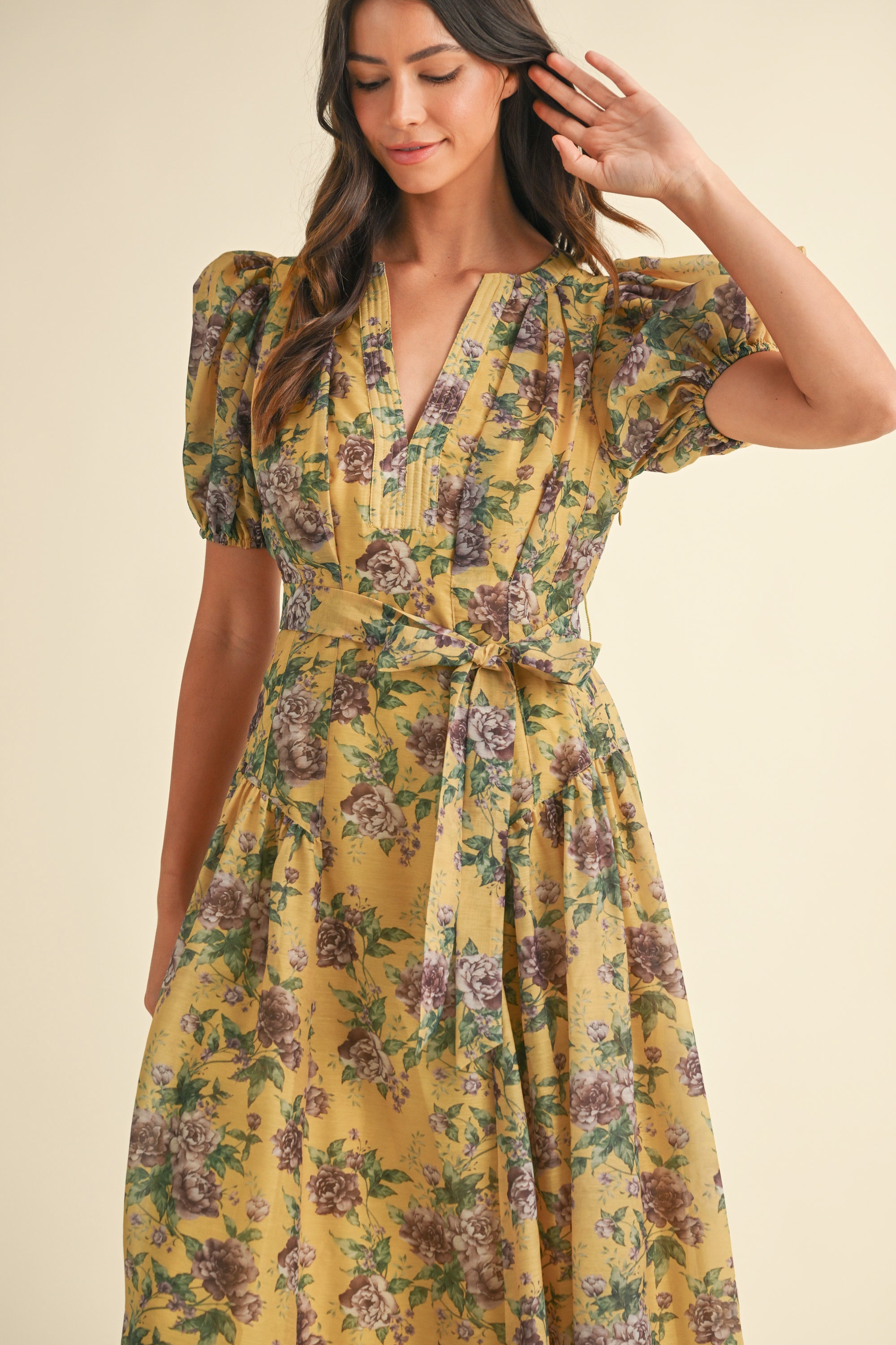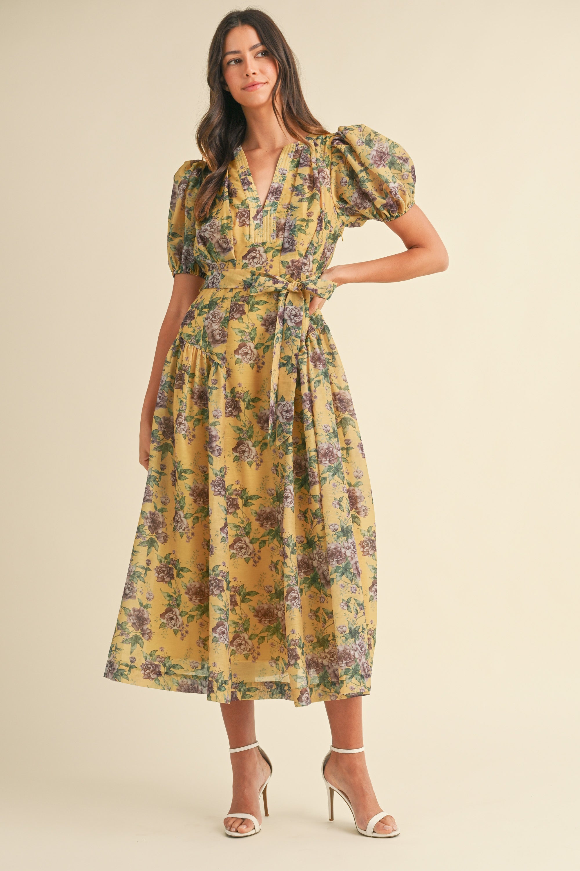 Meet the dress of your dreams: a puff sleeve, waist-belted midi wonder that wraps you in vintage romance. With a rich mustard and dusty rose palette, this floral beauty is designed to turn heads and catch hearts. The playful puff sleeves add a dash of drama, while the cinched waist gives you that hourglass silhouette. Imagine the delicate florals dancing with every step you take, creating an aura that’s both effortless and enchanting. Whether you’re strolling through a sunlit garden or on a city date night, this dress promises all eyes will be on you.