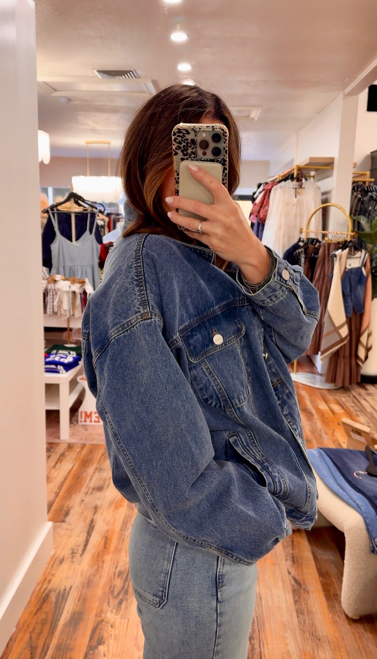 This dark wash oversized denim jacket is the ultimate layering piece your wardrobe needs. With its relaxed fit and classic button-down design, it effortlessly adds cool, laid-back vibes to any outfit. Throw it over dresses, tees, or hoodies for that perfectly undone look. Timeless, versatile, and easy to style—this jacket goes with everything and goes everywhere.