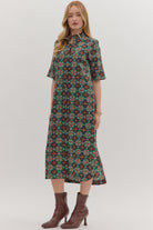 A standout statement with effortless charm — this geometric print short sleeve midi dress features a front button closure and handy side pockets for that perfect mix of style and function. Crafted in a lightweight woven fabric and fully lined for a smooth fit, it flows beautifully while keeping you cool and comfortable.