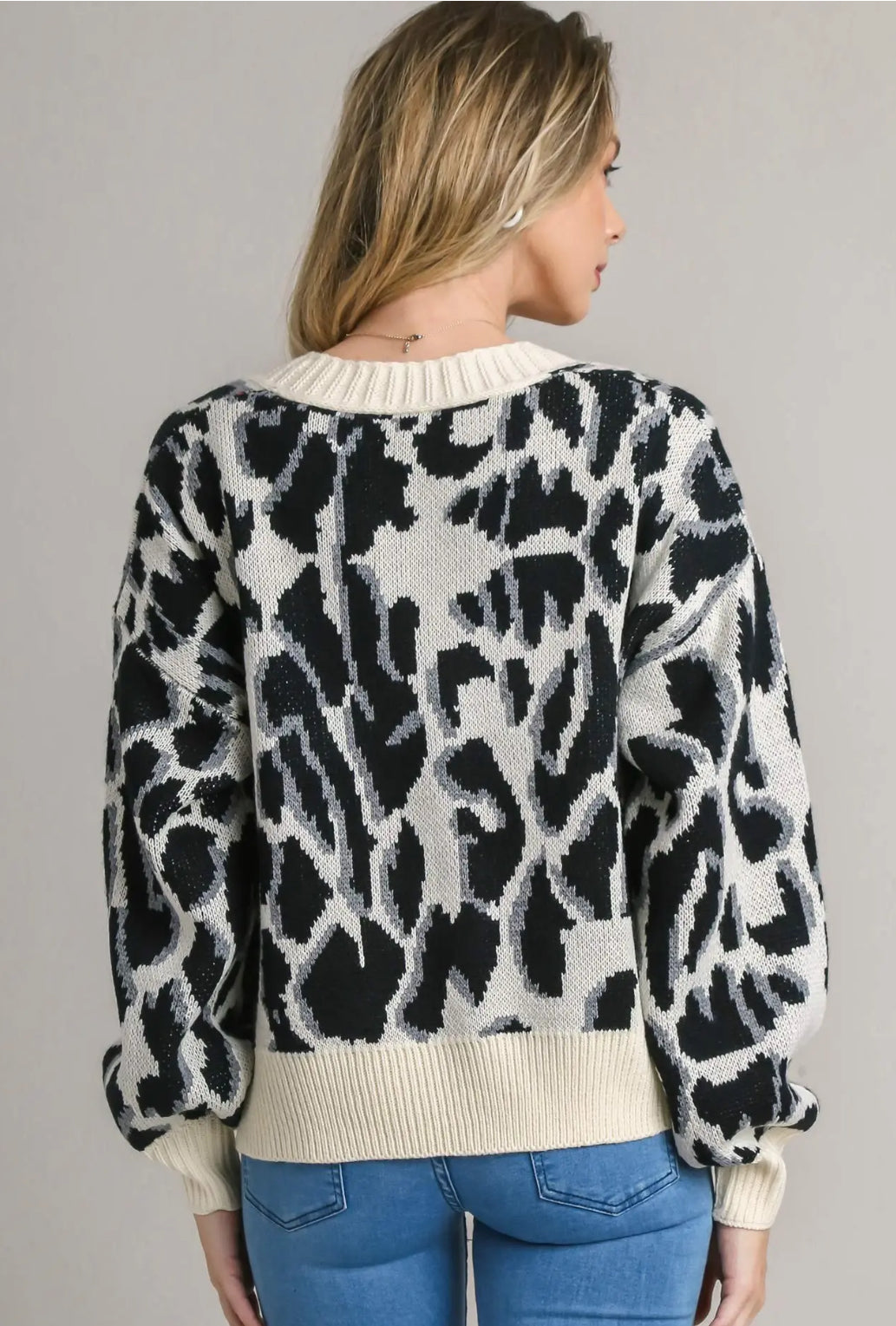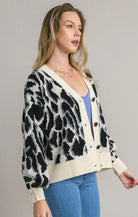 Cozy and effortlessly chic, this cream and black button-up cardigan is the perfect layering piece for fall and winter. Crafted from a soft, mid-weight knit, it features a warm cream base with sleek black contrast detailing along the cuffs, hem, and button placket. The classic button-front design lets you wear it closed for a polished look or open over your favorite tops for a relaxed, layered style. With its timeless color palette and versatile fit, this cardigan pairs beautifully with jeans, trousers, or skirts—making it a cold-weather essential for both casual days and dressed-up outings.