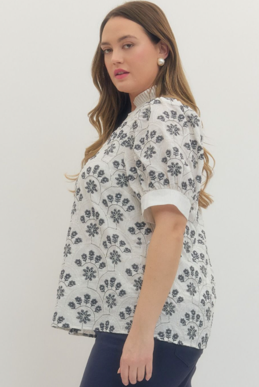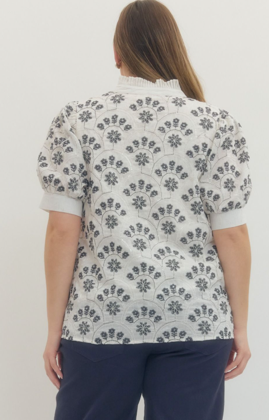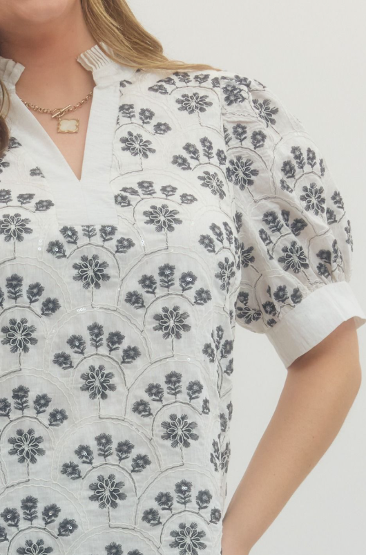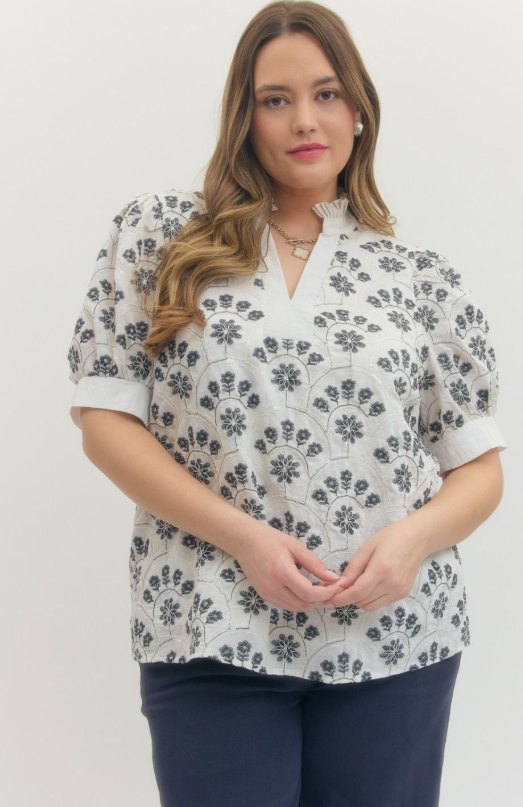 Add a touch of shimmer to your everyday style with this beautifully detailed botanical print top. Designed with feminine charm and eye-catching texture, it’s the perfect piece to dress up or down.