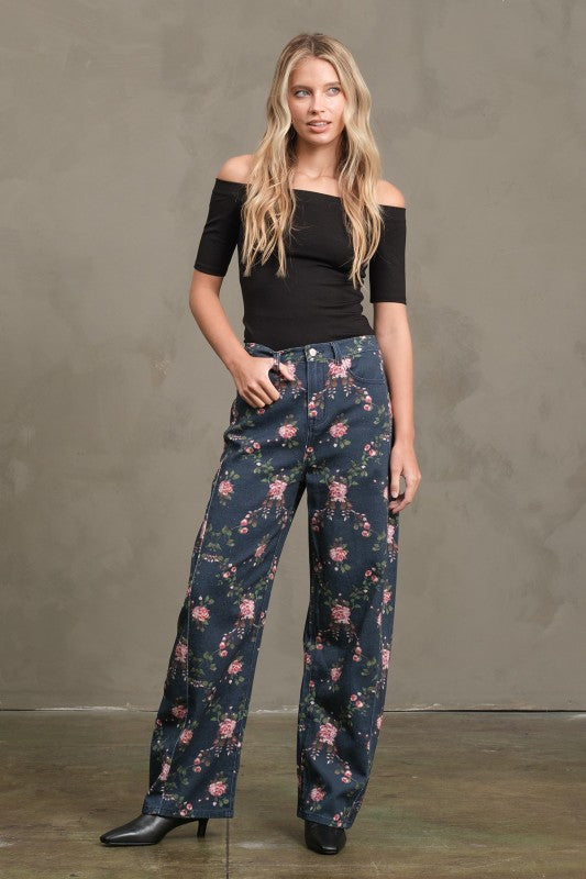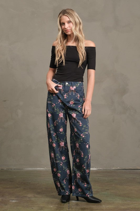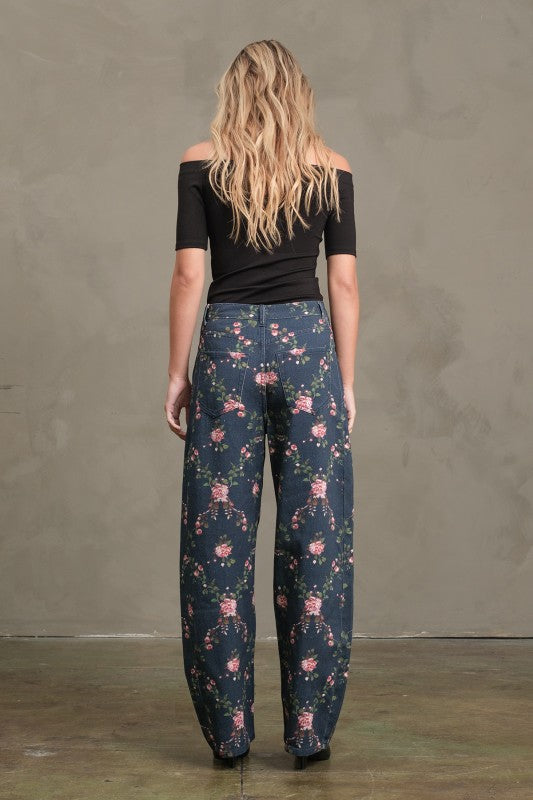 Say hello to your new statement denim - The Bloom Barrel Denim features a playful floral print with an on-trend barrel leg silhouette that’s both flattering and fun. Super cute and easy to style, these pants transition seamlessly from now into spring—pair them with cozy knits now or a light tee later. A fresh take on everyday denim that instantly elevates any outfit.