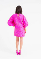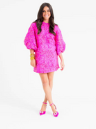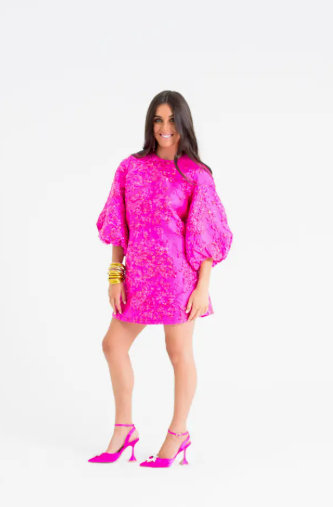 Make a statement in this stunning fuchsia textured mini dress, featuring voluminous bubble sleeves and a flattering straight silhouette. Crafted from a richly detailed jacquard-style fabric, this dress exudes luxury while keeping things fun and feminine. The above-the-knee length and structured design make it perfect for cocktail parties, weddings, or any special occasion where you want to stand out. Pair it with your favorite heels and gold accessories for a dazzling finish.