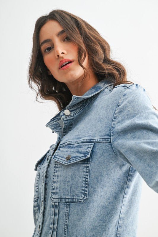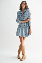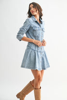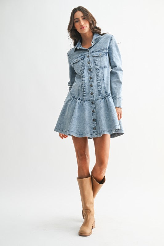 Crafted from lightweight denim, it features intricate woven-inspired patterning that adds a touch of artistry and texture, giving it that dreamy, boho-boardwalk vibe. The button-front design allows for easy styling, while the long sleeves keep it chic and versatile from season to season. Finished in a flattering mini length, it’s the perfect balance of comfort and style.