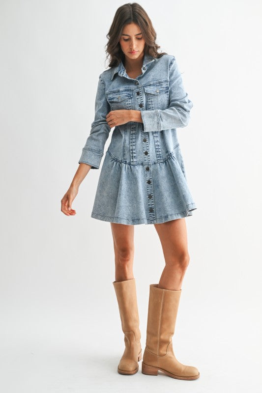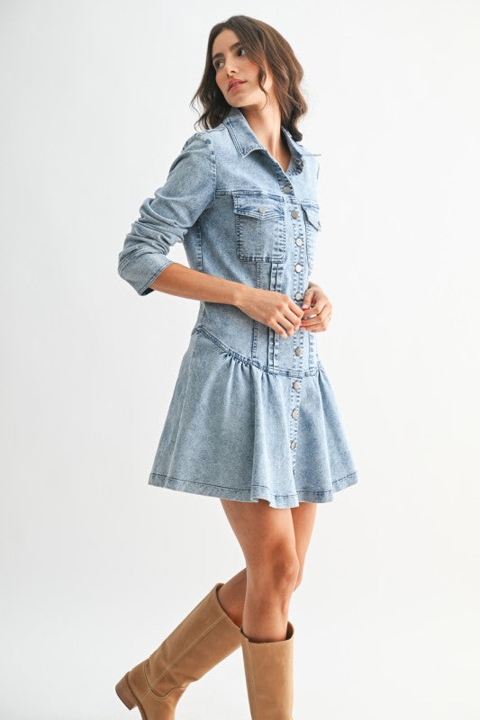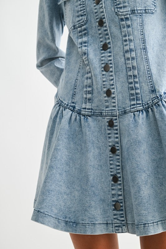 Meet the denim dress that does everything—a stunning blend of bohemian charm and everyday wearability. This long-sleeve button-up mini dress channels the effortless feel of a relaxed maxi with its flowy silhouette, soft structure, and thoughtfully curated details.