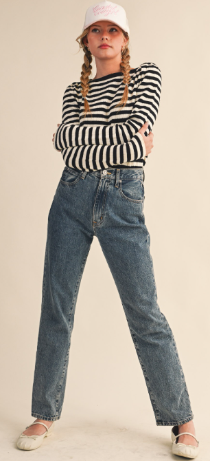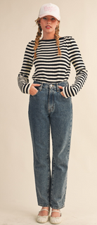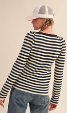 A timeless essential with effortless appeal. This long sleeve shirt features classic black and ivory stripes for a clean, modern look that never goes out of style. Designed with a soft, lightweight feel and a relaxed silhouette, it’s perfect for layering or wearing on its own. The simple crew neckline and easy drape make it a go-to piece for everyday wear, from casual outings to laid-back weekends.