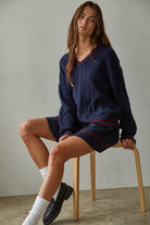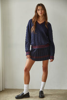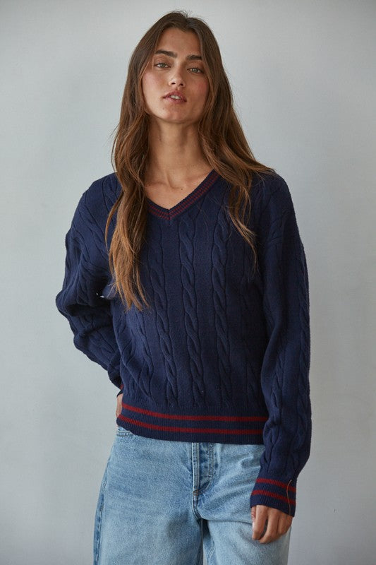 This navy cable knit v-neck sweater is a classic with a bold twist. The timeless cable knit texture gives it a cozy, polished feel, while the pop of red detailing around the v-neckline adds a sporty, eye-catching contrast. Perfect for layering over a crisp button-down or wearing solo with your favorite denim, it’s a sweater that takes you from casual weekends to chic fall outings with ease.