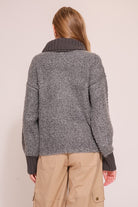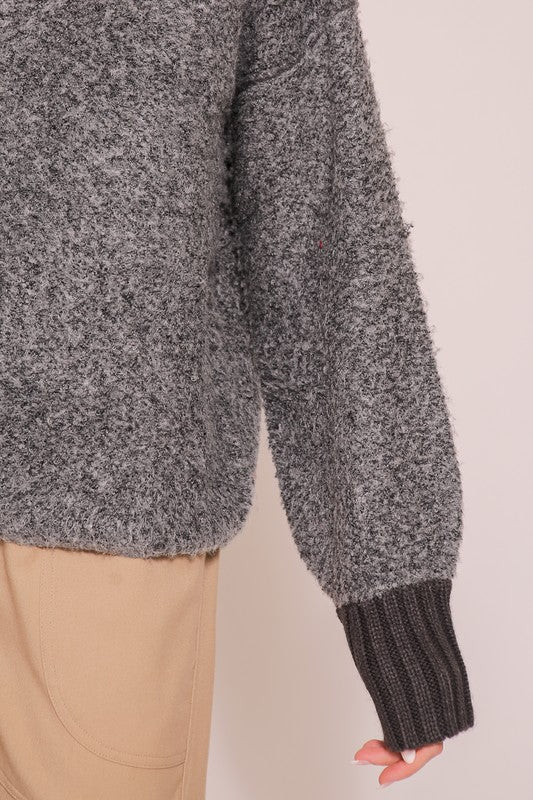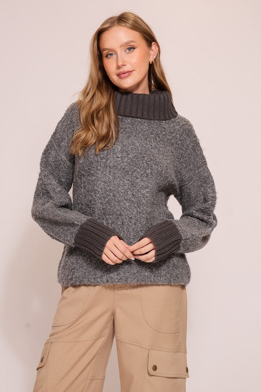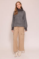 This charcoal drop-shoulder turtleneck sweater blends contemporary style with everyday comfort. Featuring a relaxed fit, slouchy sleeves, and a smooth knit texture, it delivers an elevated yet laid-back aesthetic ideal for casual or styled outfits.