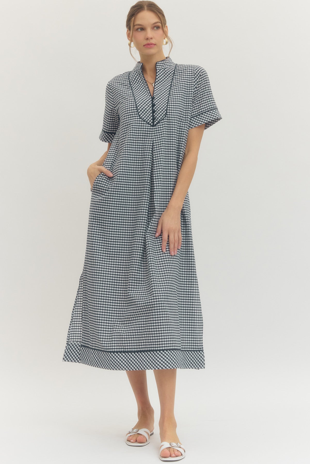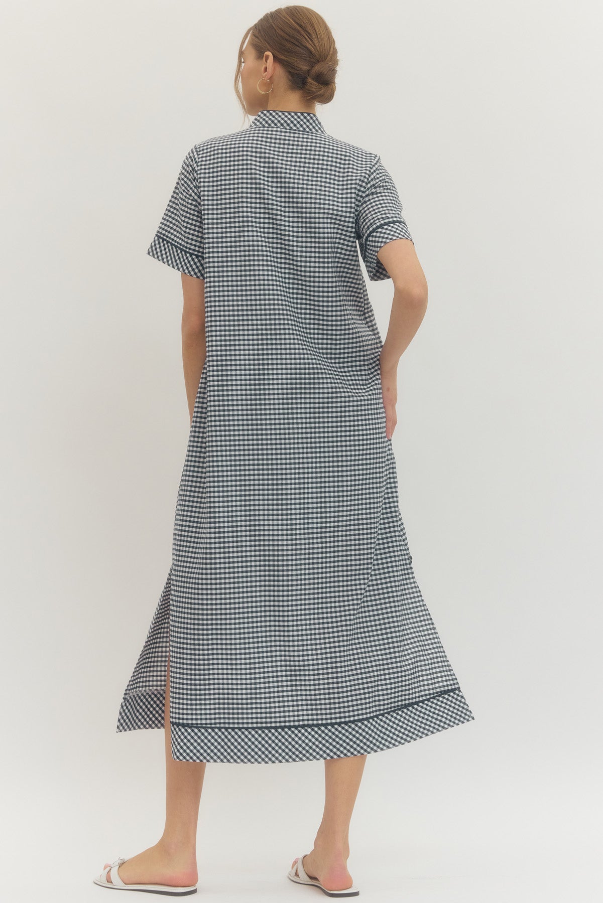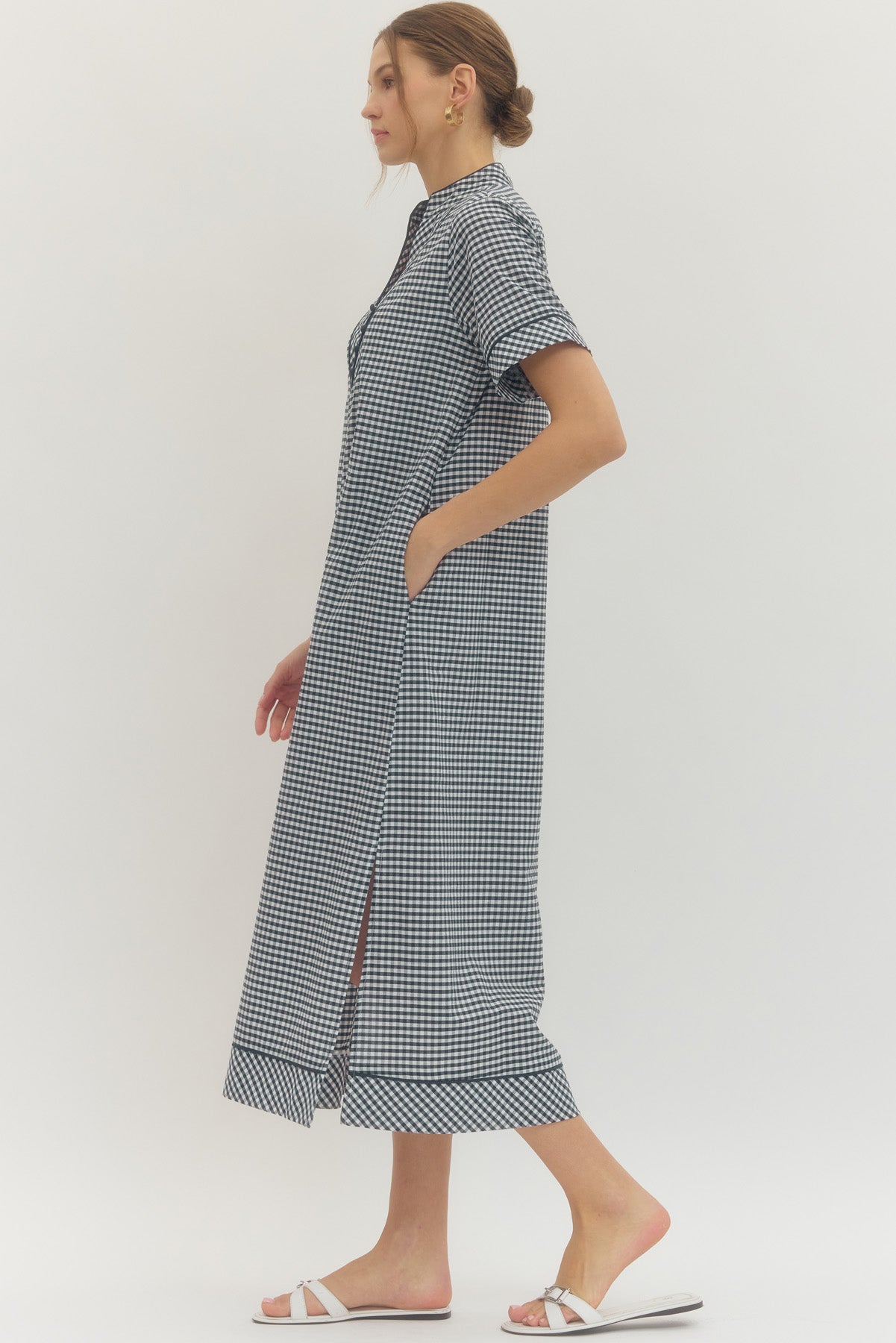 This navy check dress blends classic pattern with a clean, modern silhouette. Designed with short sleeves and a straight, easy fit, it features subtle side slits that add movement and sophistication. Effortlessly chic and endlessly wearable, this dress transitions seamlessly from day to night with minimal styling.
