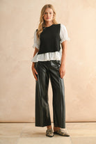 This black and white sweater combo short-sleeve blouse is the perfect blend of polished and easy. Designed to pair effortlessly with coated black denim, your favorite everyday jeans, or a classic dress pant, it transitions seamlessly from casual to dressed-up. The sweater-inspired texture adds just the right amount of structure while the short sleeves keep it comfortable and versatile. An essential, wear-anywhere piece your closet will thank you for.