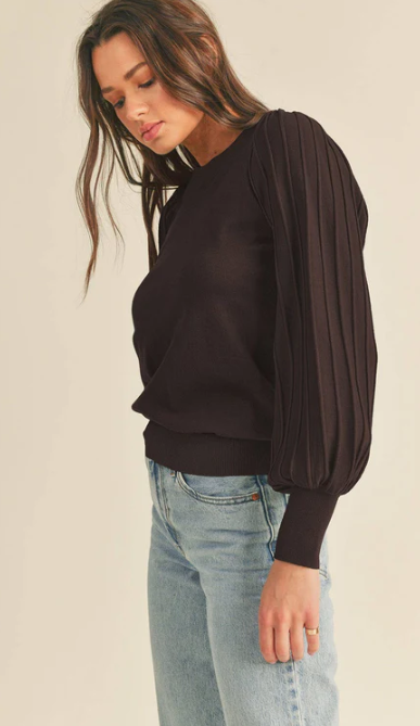 This black long-sleeve top features softly textured sleeves with subtle volume for an elevated everyday look. Crafted from a lightweight knit, it balances structure and comfort, making it perfect for both work and weekend styling. A timeless staple that pairs effortlessly with tailored bottoms or denim.