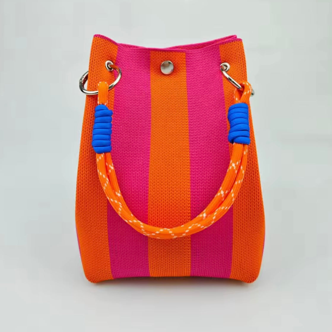 This vibrant purse features bold orange and fuchsia stripes on textured woven fabric, with a playful rope-and-cord handle accented by silver hardware. Compact and colorful, it’s a perfect statement piece for beachy, carefree style.