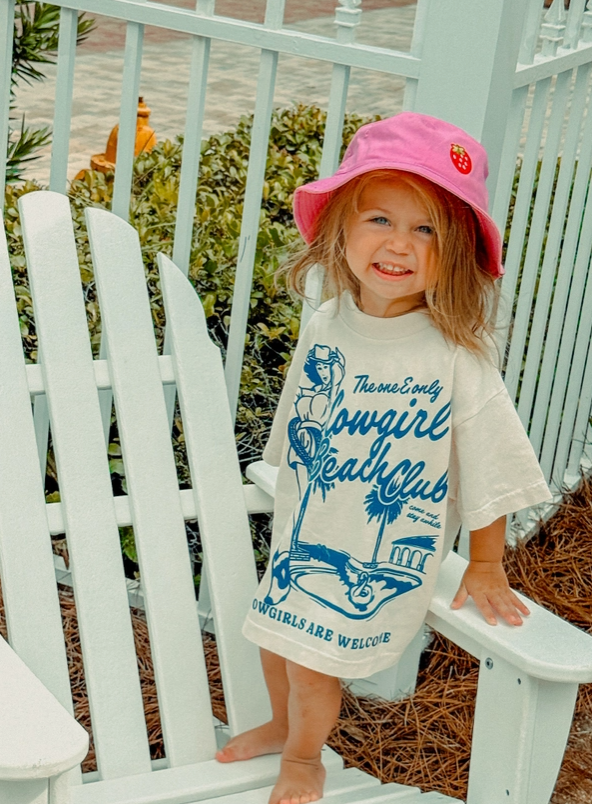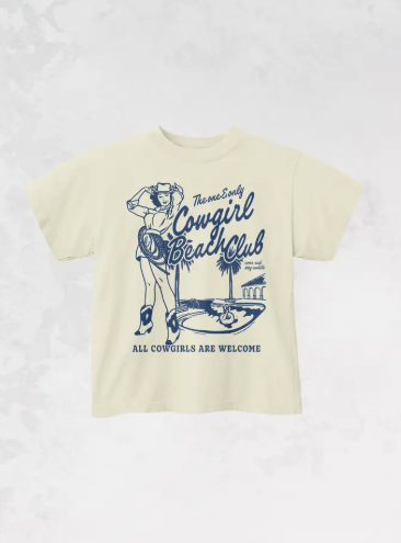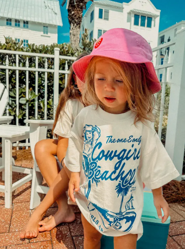 Get all of the Beachy vibes in our Kids Boxy Cowgirl Beach Club inspired tshirt! - Features "The one & only Cowgirl Beach Club" with a beach club and cowgirl illustration and " All cowgirls are welcome " in a navy ink - Screen print transfer that is heat pressed onto each tshirt - Tshirt is a super soft vintage wash that gets softer after each wash, features drop shoulder and a double stitch collar - Meant to be a Boxy fit