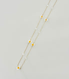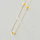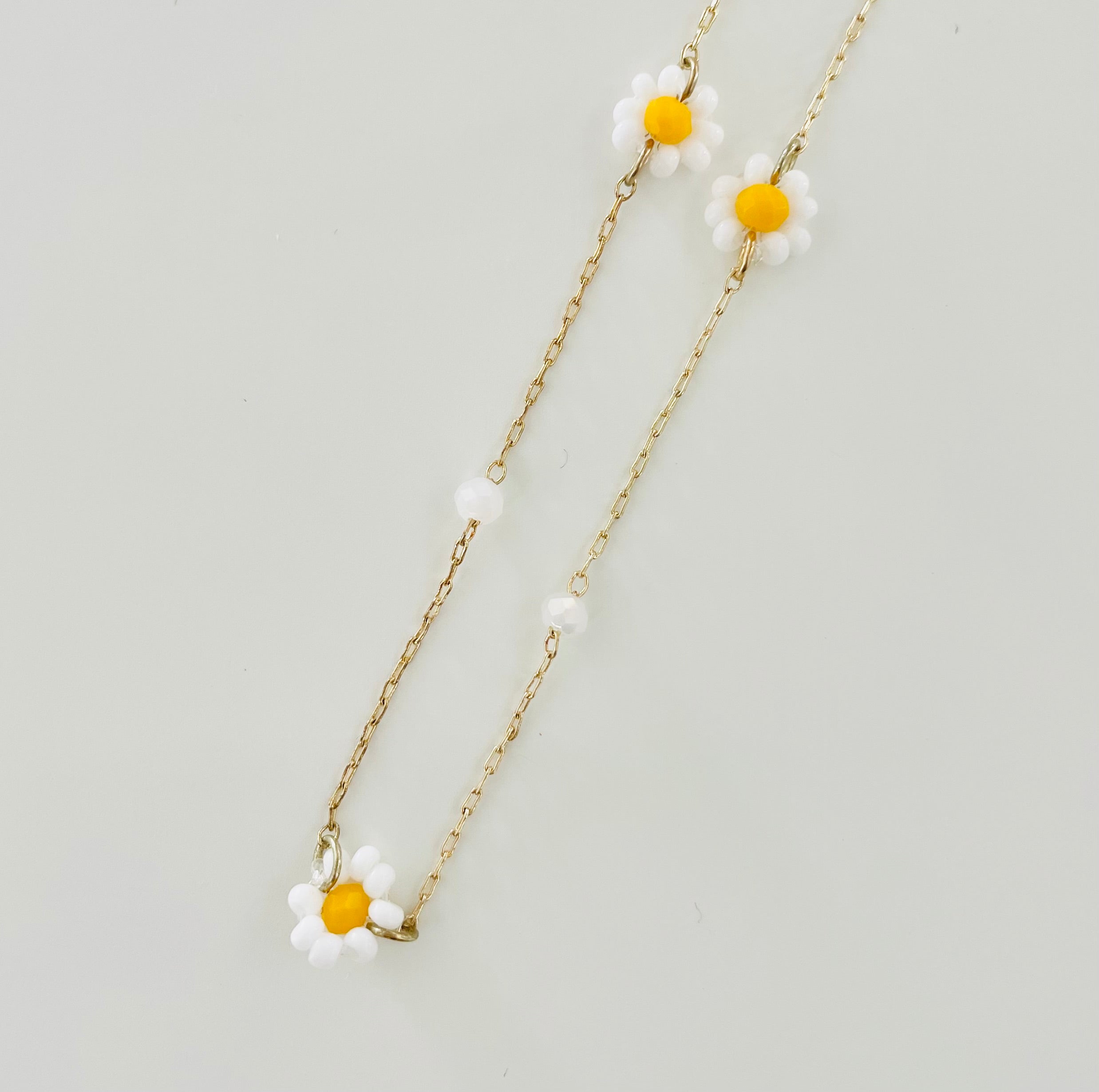 A dainty gold necklace featuring delicate beaded daisies and pearl accents. Feminine and elegant, it adds a soft floral touch to any outfit.