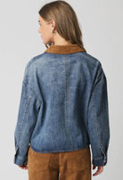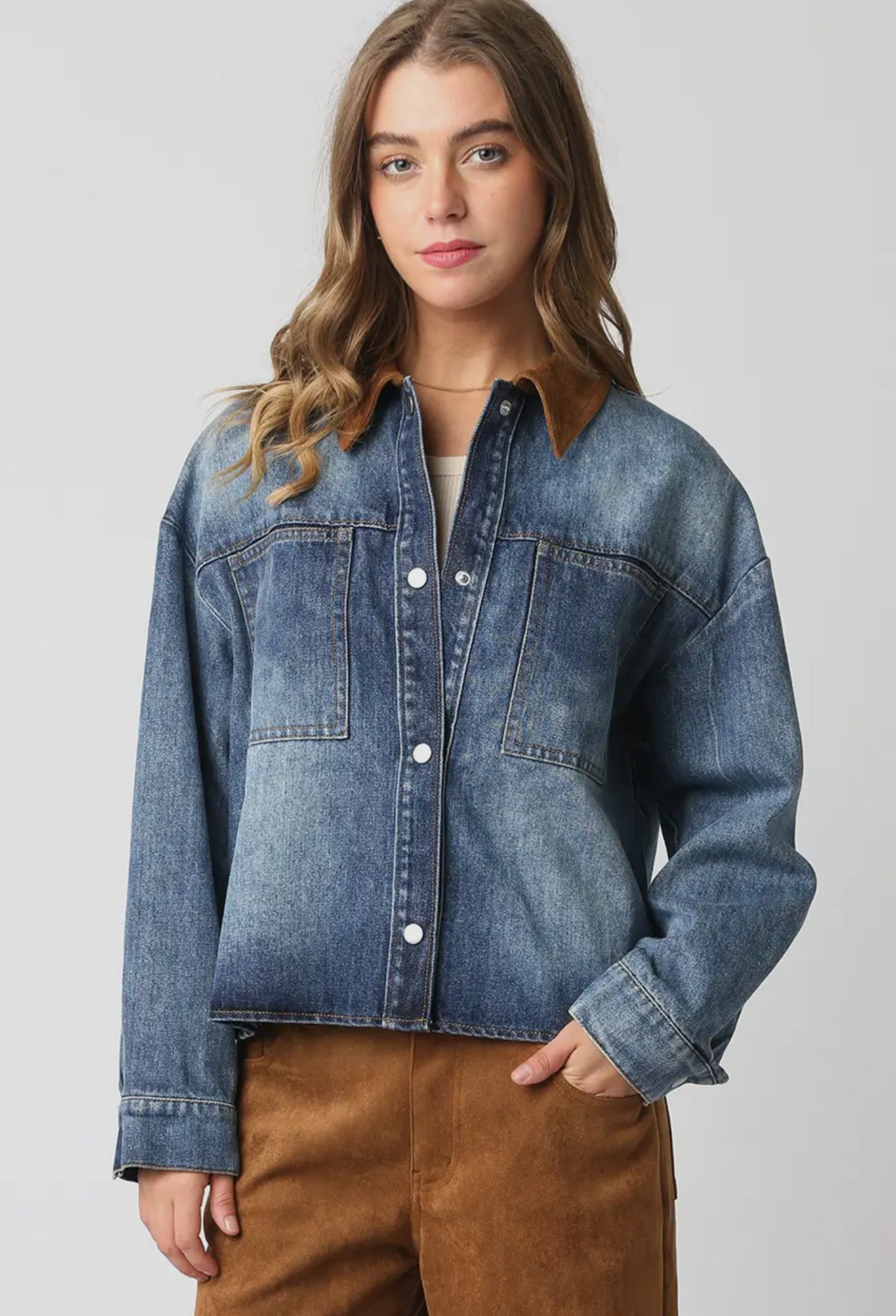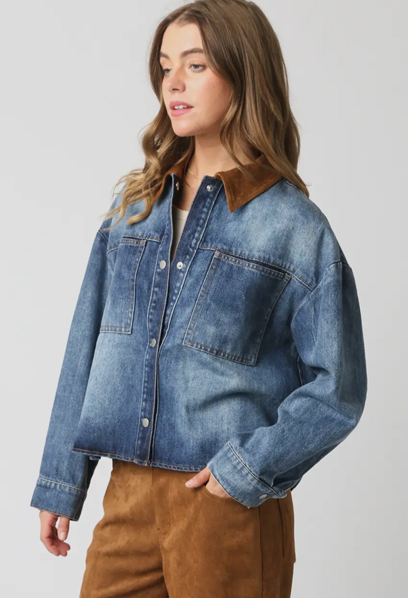 This classic denim jacket blends rugged charm with elevated detail. It features a full button-down front, dual chest pockets with flap closures, and side welt pockets for easy wear. The standout detail is its contrasting dark brown corduroy collar, adding texture and warmth for fall. Crafted from durable denim with a structured yet comfortable fit, it’s a timeless layer perfect for everyday wear—from casual days out to cool-weather evenings.