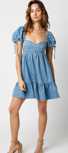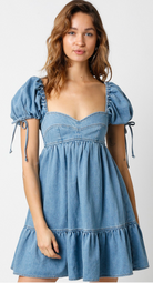 This Denim Tie Dress blends playful charm with a flattering silhouette. Designed with a structured bustier bodice and soft puff short sleeves, it creates a balanced, feminine shape. The babydoll skirt offers an easy, flowy fit, while the tie detail adds a sweet, adjustable finish. Crafted from denim, this dress delivers both structure and comfort for everyday wear.