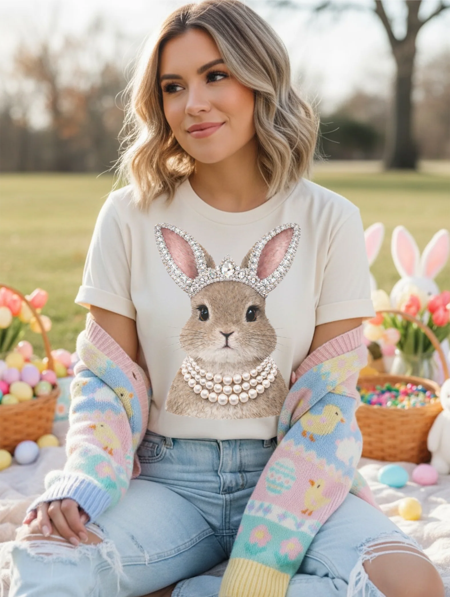 Sweet, classy, and just a little extra — the Dolled Up Bunny Tee is ready for her moment. This soft cream tee features the cutest bunny dressed to impress, complete with elegant pearls and a sparkling rhinestone tiara. It’s the perfect mix of playful charm and girly glam.