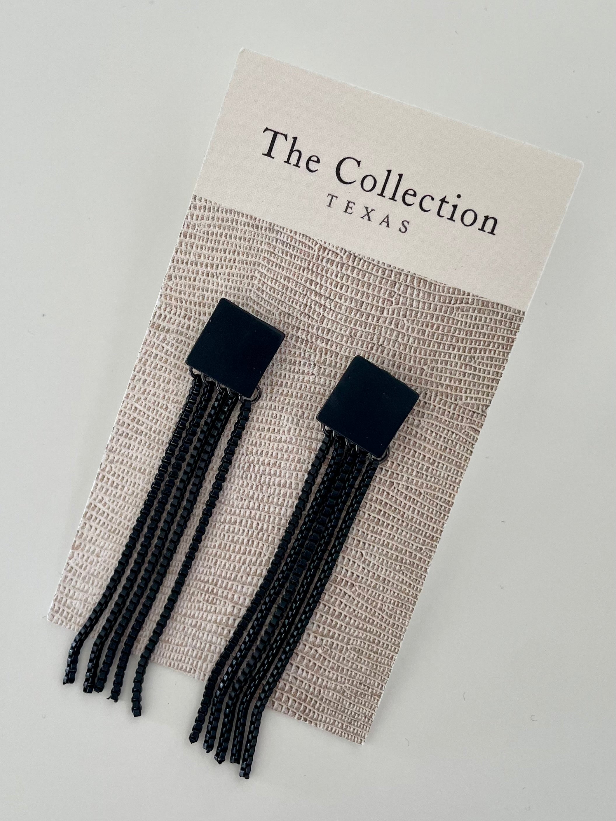 Elegant Fringe Earrings – black earrings featuring 2-inch metal fringe for a bold, statement-making look. Sleek, edgy, and perfect for adding movement to any outfit.