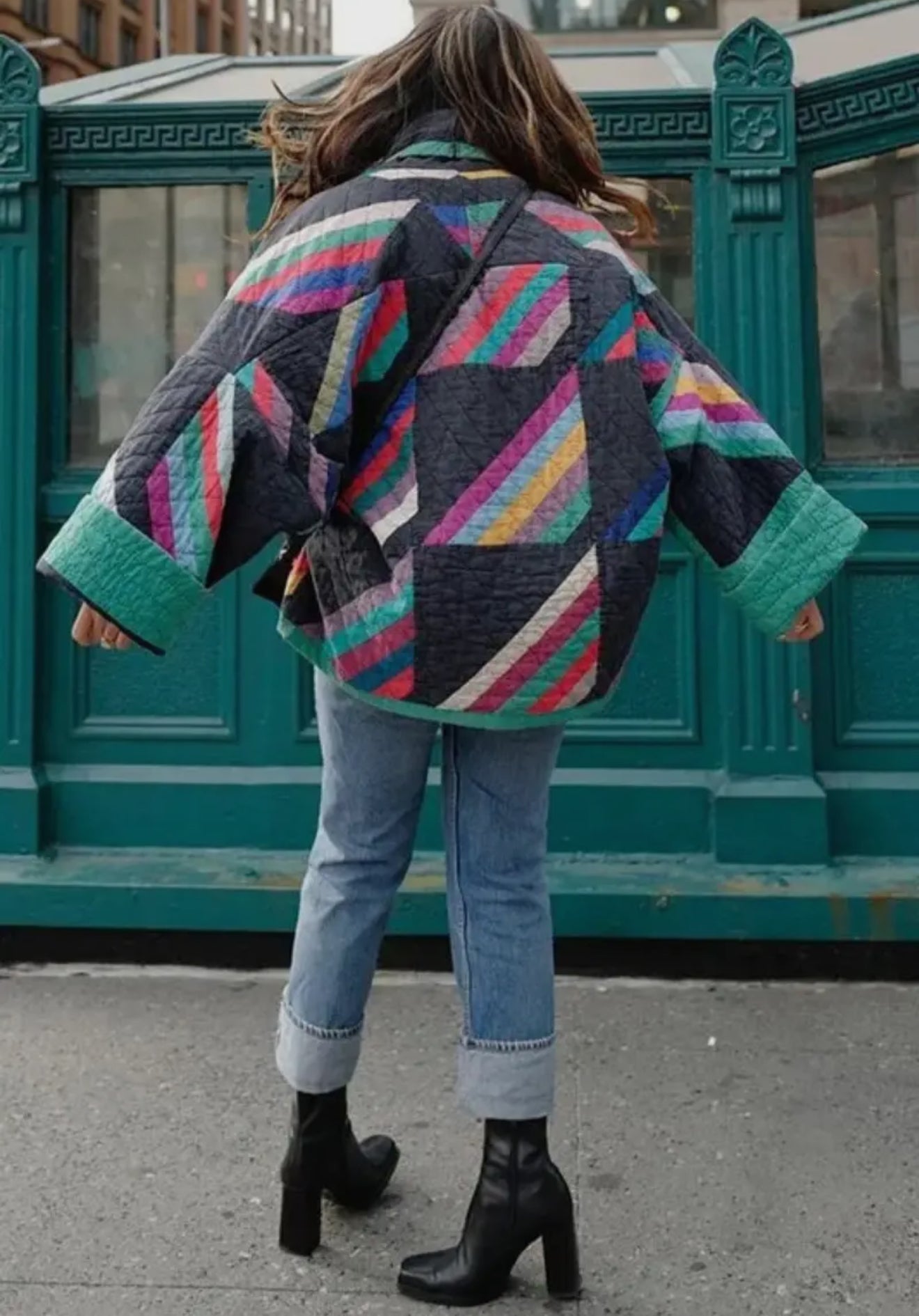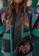 A total showstopper—this long-sleeved patchwork coat is a wearable work of art. Featuring rich shades of green, turquoise, and black stitched together in a bold patchwork design, no two sections are alike, making each coat truly one of a kind. The playful mix of color and texture brings instant personality, while the cozy structure keeps it effortlessly wearable.