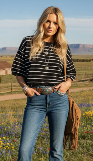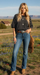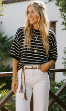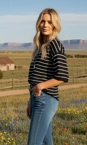 A relaxed yet polished essential, this striped knit top offers a soft, breathable feel and an effortlessly chic look. Featuring a crew neckline and dropped shoulders, the loose short sleeves create a comfortable drape perfect for warm days. Easy to tuck or wear loose, it pairs beautifully with denim, linen, or white bottoms for an elevated casual outfit that transitions seamlessly from weekday to weekend. striped top, knit tee, short sleeve, relaxed fit, crew neck, soft knit, everyday wear, casual chic, summer outfit, boho basics, minimal style, versatile top, coastal look, neutral stripes