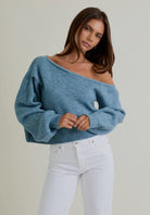 Turn heads in this asymmetrical one-shoulder sweater top in the dreamiest shade of denim blue. Its chic silhouette strikes the perfect balance of cozy and sexy — soft knit texture meets an effortlessly flirty neckline. Pair it with white jeans for a crisp, elevated look or style it with denim for that tonal, cool-girl vibe. A must-have statement piece for your fall and winter wardrobe.