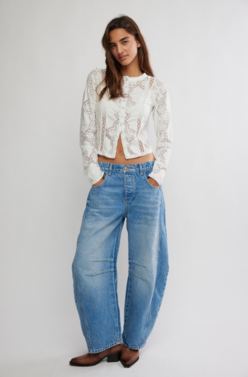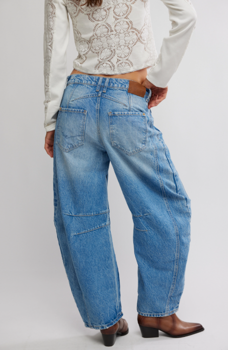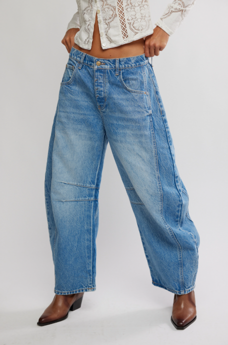 So bold barrel jeans from our We The Free collection featured in a mid-rise fit with subtle distressed detailing and wide-legs that taper at the ankle.