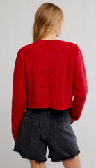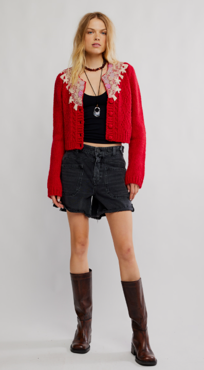 This vibrant red sweater features a chunky knit design with a cozy, textured pattern throughout. It has a cropped fit that adds a modern, trendy touch. The standout detail is the intricate embroidered floral embellishment along the neckline and shoulders, showcasing shades of pink and cream with delicate lace accents. The sweater closes with matching red buttons down the front, blending seamlessly into the knit. Perfect for layering over a simple top, this sweater combines bold color with feminine, artistic detailing for a stylish and unique look.