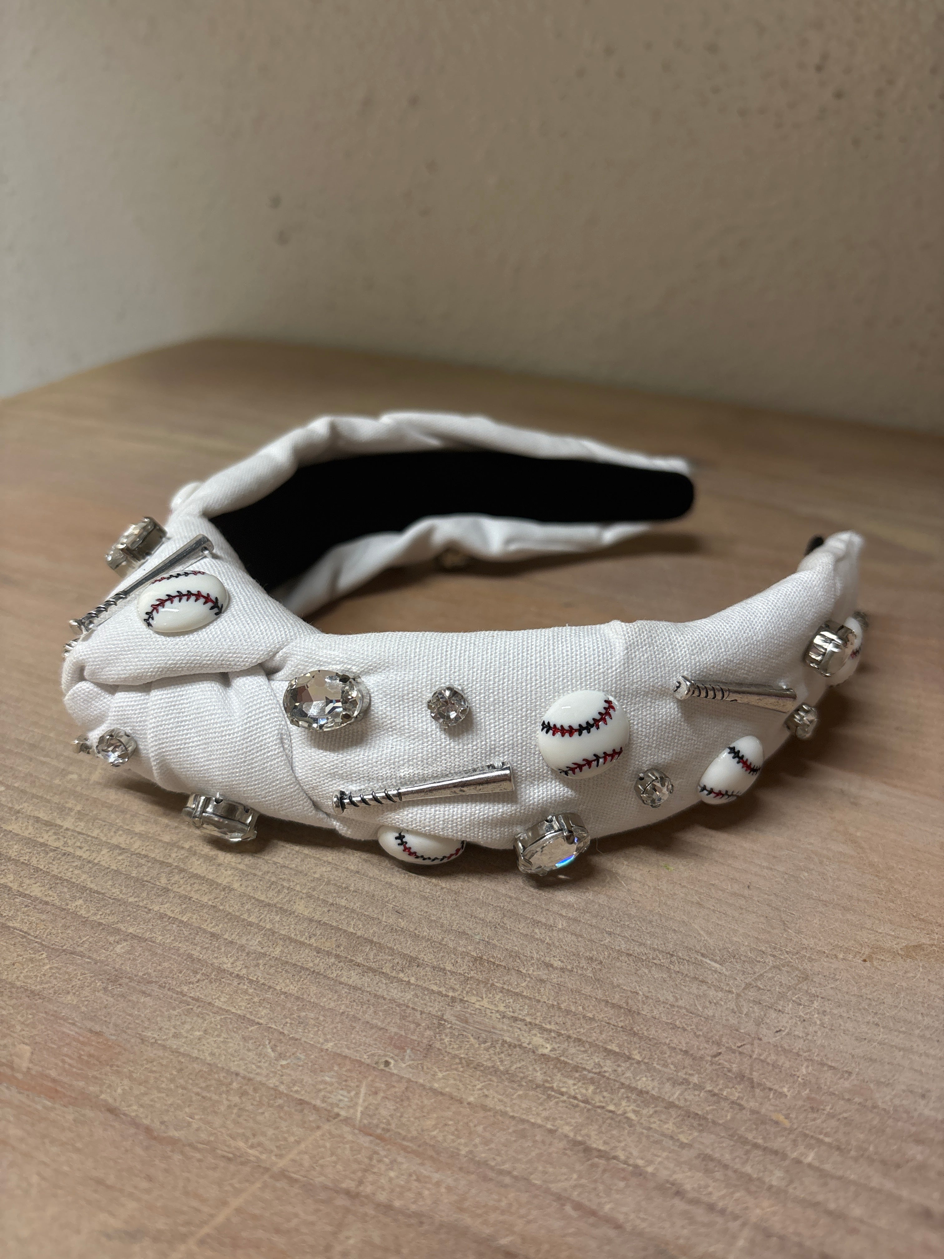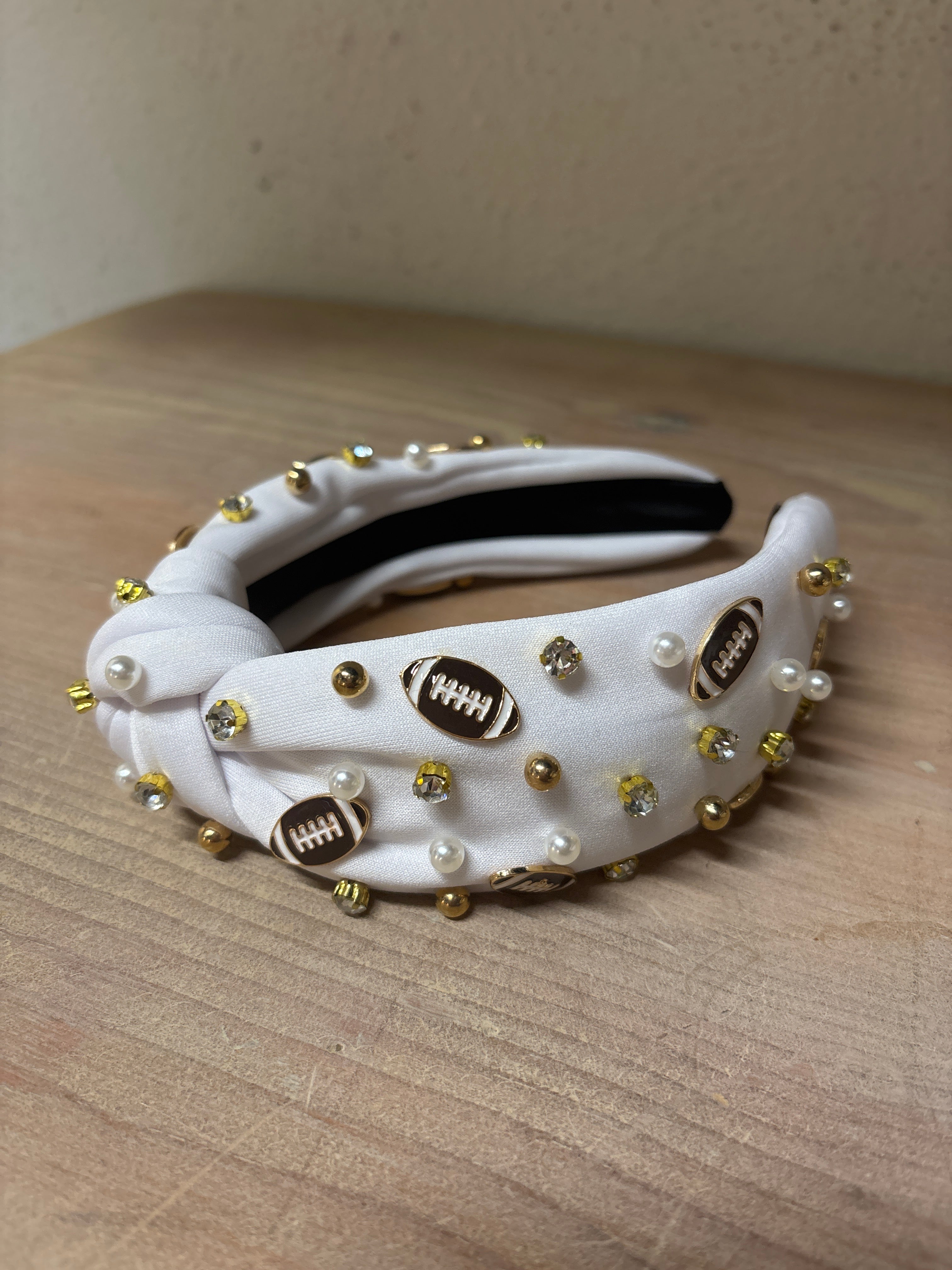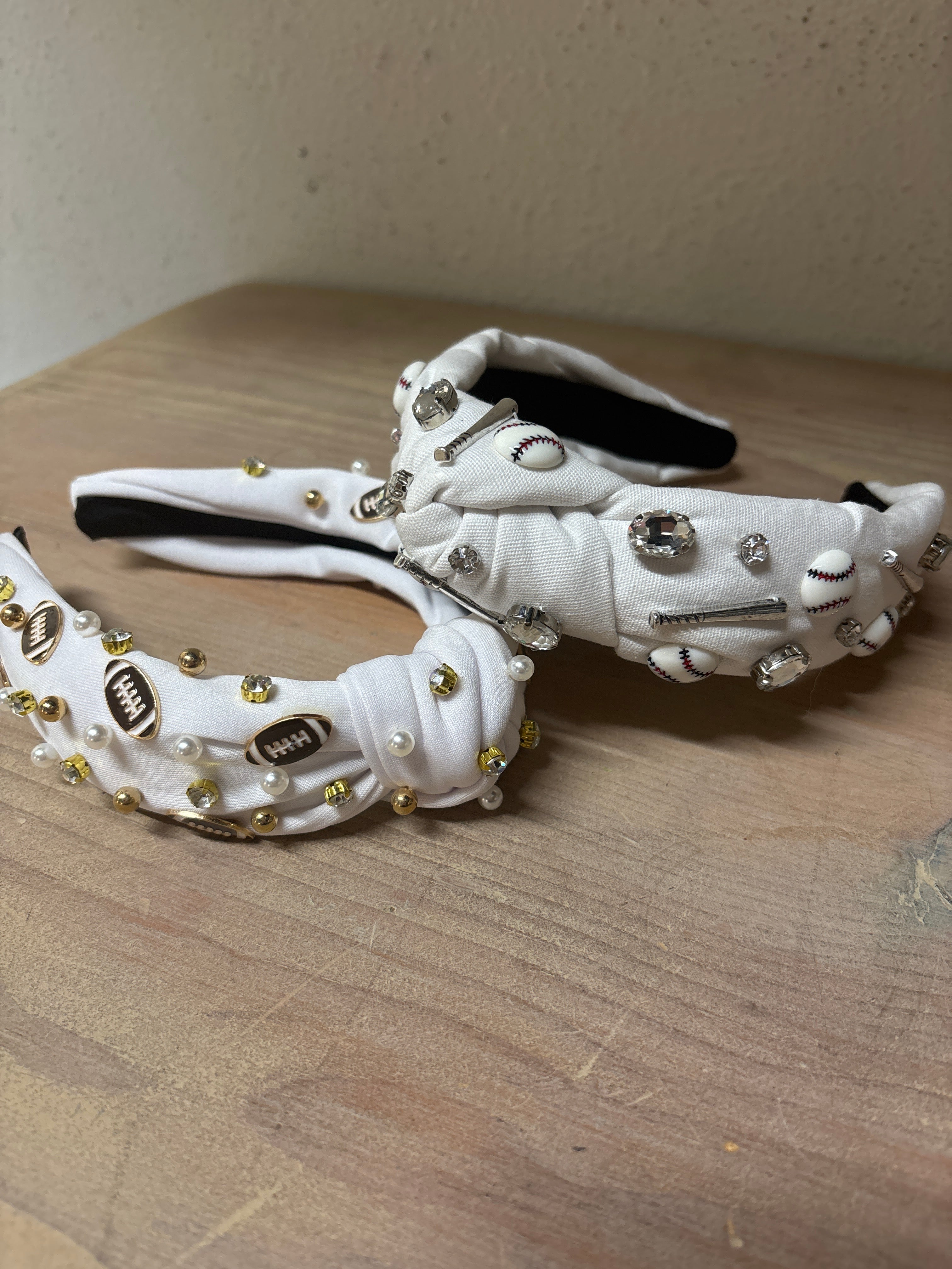 Shine bright on game day with our White Jeweled Knot Headband — the perfect blend of team spirit and chic style. Crafted from smooth white fabric and finished with a signature top knot, this standout accessory is embellished with dazzling jewels that add the perfect touch of sparkle under stadium lights.