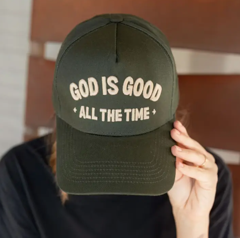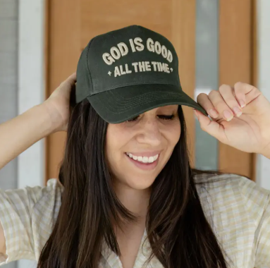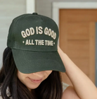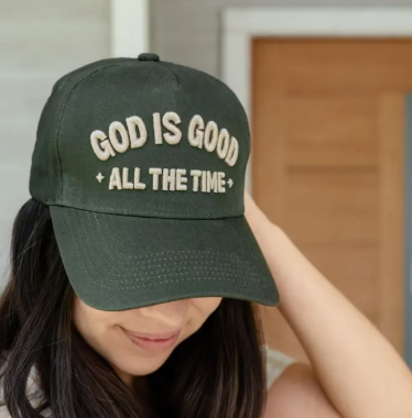 "God is good all the time " Embroidered Hat Product Details: * Material: 100% Cotton * Color: Dark Green with cream wording * Adjustment: Adjustable snapback * Fit: Unisex Our hat features the declaration "God is good all the time" beautifully embroidered, serving as a daily declaration of the goodness of God. Made from 100% cotton, it provides a soft and comfortable fit, perfect for everyday wear.