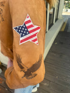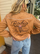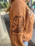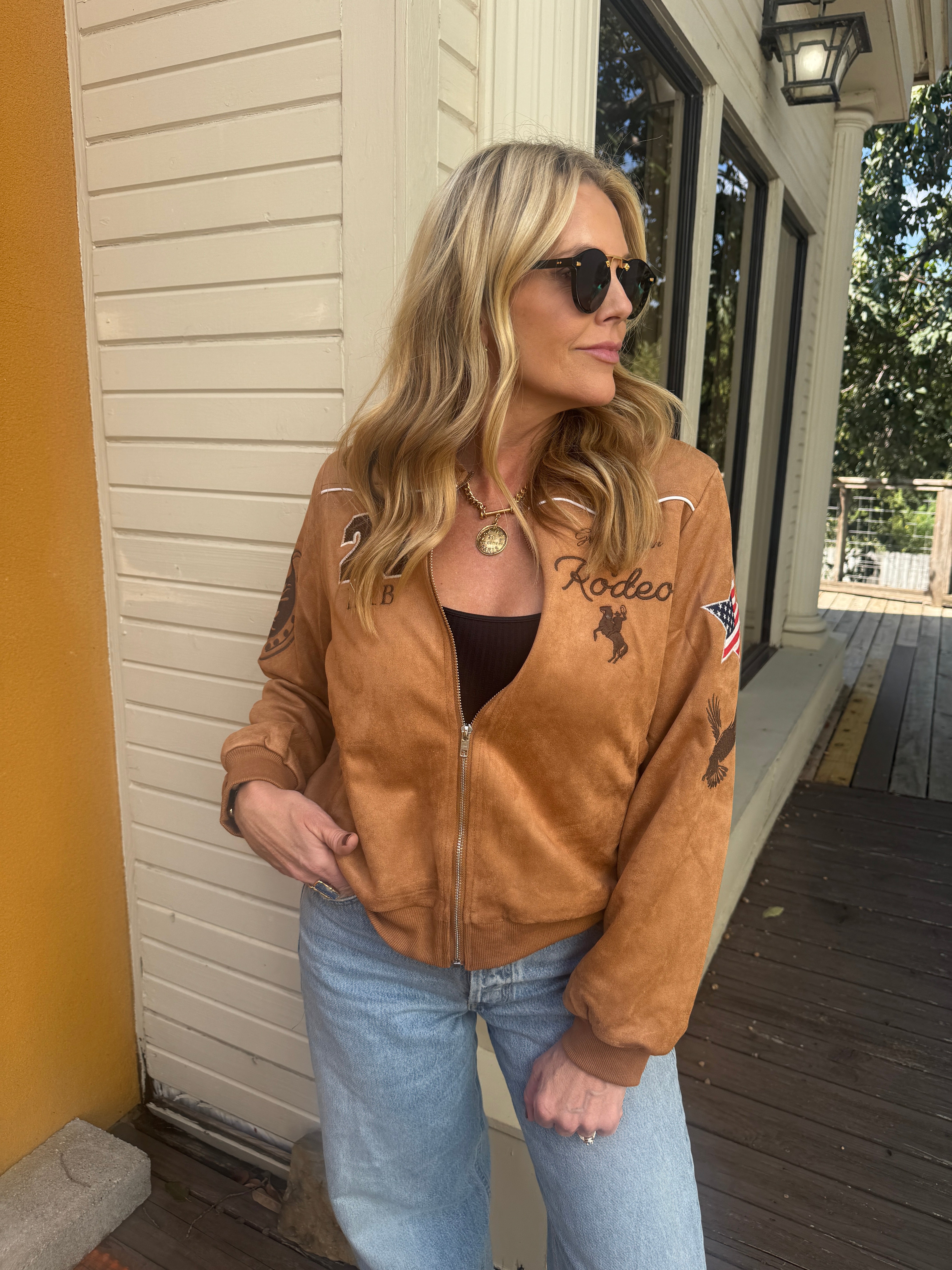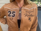 This camel brown suede jacket is a rodeo staple with timeless western flair. Crafted from soft, luxe suede, it features a tailored silhouette that’s both flattering and versatile. The warm camel hue pairs effortlessly with denim, boots, or a statement dress, while subtle western stitching and front pockets add authentic detail. Whether you’re headed to the rodeo, a country concert, or a fall night out, this jacket layers perfectly over any look — the kind of piece that gets better with every wear and instantly gives off that true cowgirl confidence.