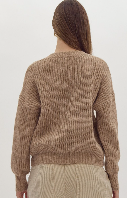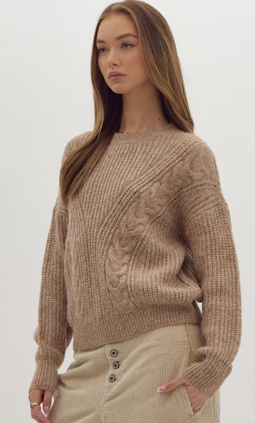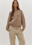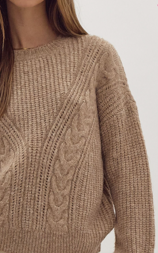 Elevate your everyday style with this timeless taupe cable knit sweater, designed for effortless comfort and versatility. Crafted from a soft, mediumweight knit, it offers warmth without bulk, making it perfect for layering through cooler seasons.