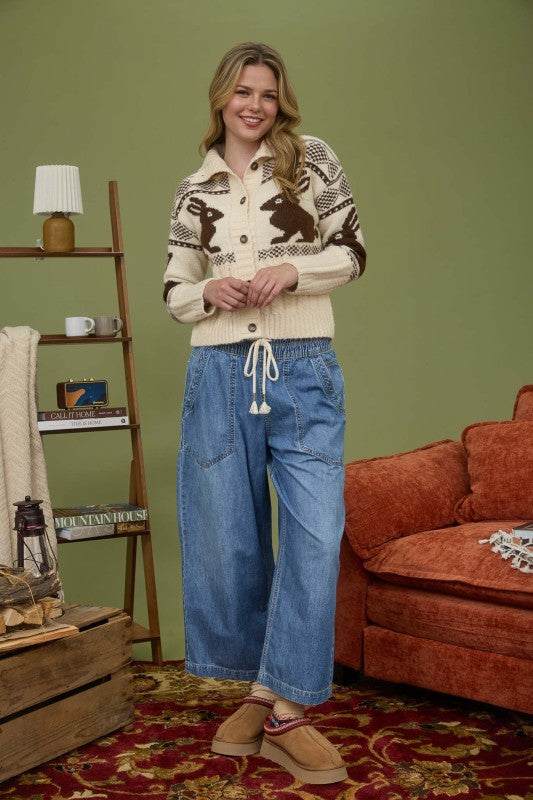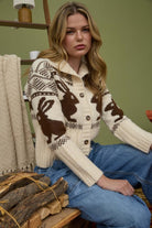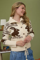 Sweet and timeless, this cream knit cardigan features an adorable brown bunny jacquard design that adds a playful touch to a classic silhouette. Finished with a collared neckline and button-down front, it’s the perfect layering piece for crisp days and cozy nights. Style it over a simple tee with denim or pair it with a skirt for a charming, polished look.