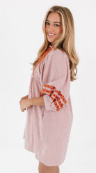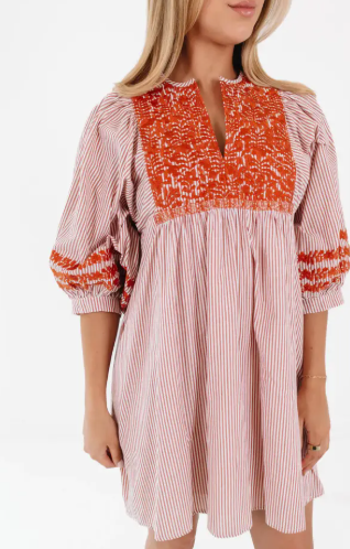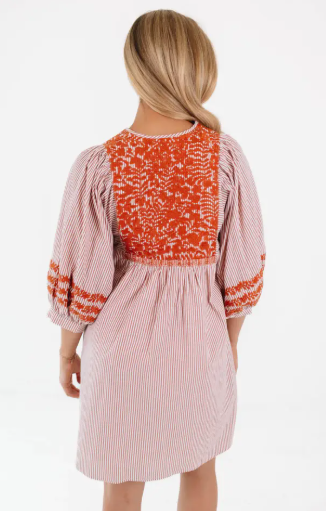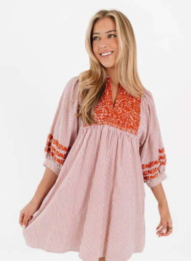 This playful dress features burnt orange and white stripes with intricate burnt orange embroidery for a spirited, standout look. The v-neckline and three-quarter sleeves add a hint of polish, while the breezy silhouette keeps it effortlessly comfortable. Perfect for college gameday or a casual brunch, this dress brings together charm and team spirit in style!