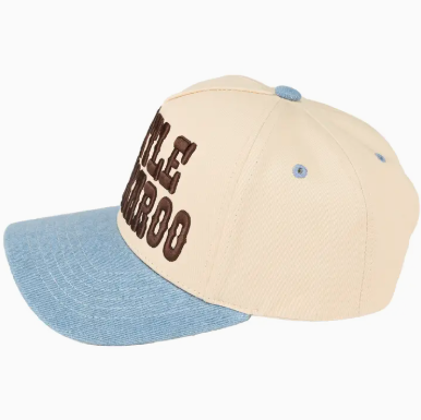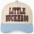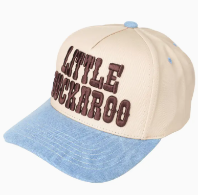 Saddle up, little partner! This charming cream hat with its denim-colored bill is the perfect accessory for any young cowboy's rodeo adventures. Whether he's cheering from the stands or dreaming of the big show, this Little Buckaroo hat brings authentic western style to his wardrobe. Comfortable and eye-catching, it's sure to make him feel like a true rodeo star. Let the adventures begin!