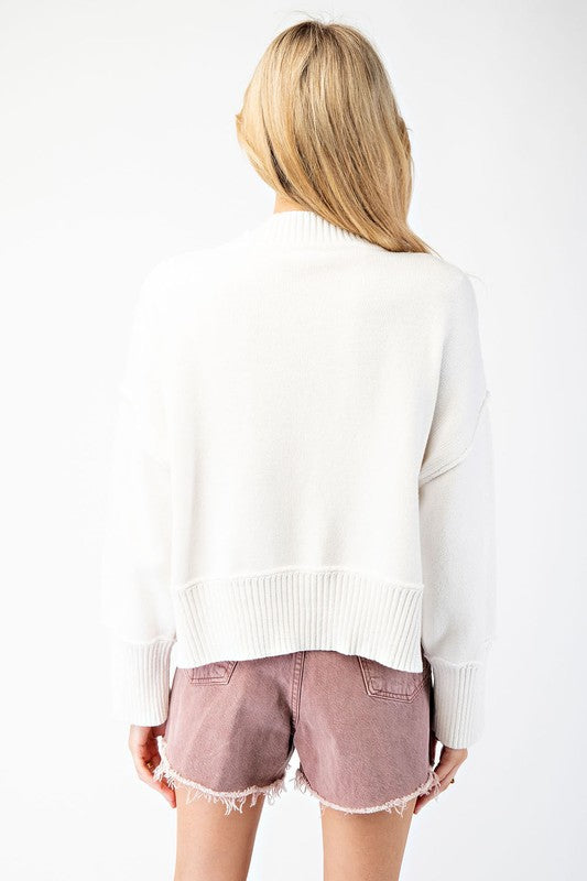 The Love Me Do Sweater is both stylish and comfortable. Made with a ribbed mock neckline, dropped shoulders, and ribbed cuffs and bottom band, this long sleeve sweater is the perfect addition to any wardrobe. The relaxed fit and side slits allow for easy movement, making it a great choice for any occasion.