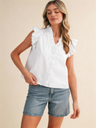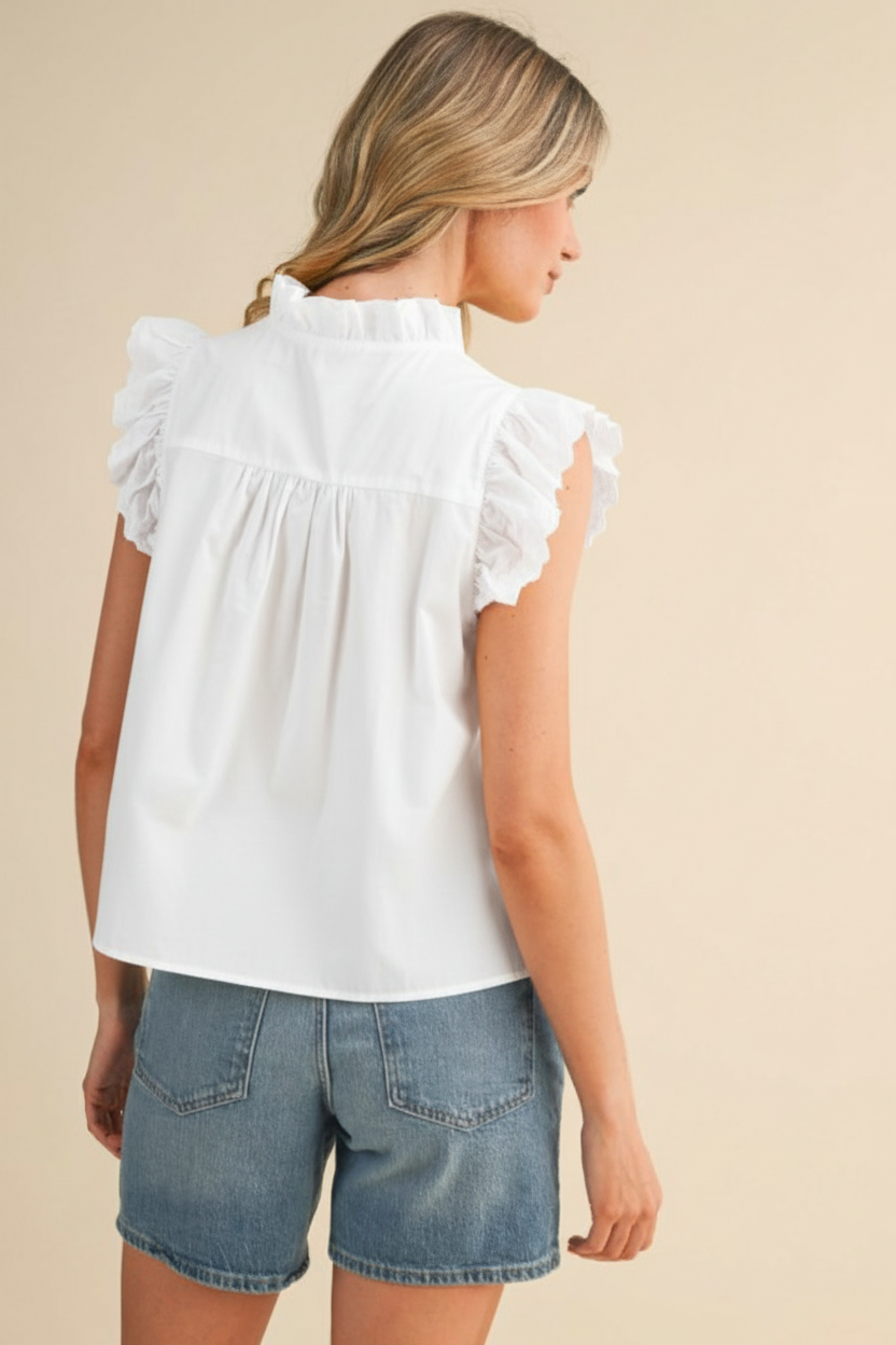 Meet your new summer staple—this white lace trim sleeveless top is the definition of effortless elegance. Designed with delicate lace detailing and soft ruffled shoulders, it brings just the right touch of femininity to a classic silhouette. The button-down front keeps it timeless and versatile, making it easy to style tucked into denim, paired with skirts, or layered under a light jacket. Lightweight and breathable, it’s the kind of elevated basic you’ll reach for all season long—polished enough to dress up, but easy enough for everyday wear.